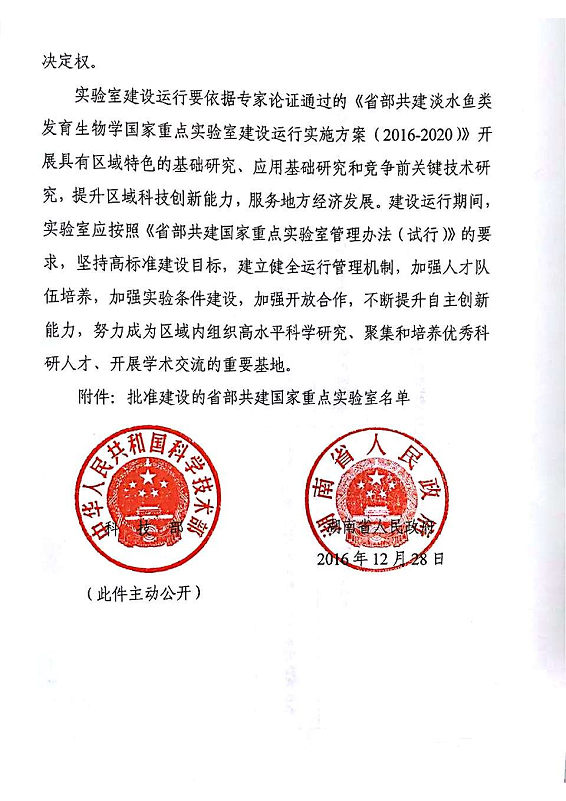 (记者 粟用湘 卢映红)2016年12月28日,科学技术部和湖南省人民政府批准依托我校建设省部共建淡水鱼类发育生物学国家重点实验室(以下简称“实验室”)。2017年1月16日,《科技部湖南省人民政府关于批准建设省部共建淡水鱼类发育生物学国家重点实验室的通知》(国科发基[2016]427号)印发。这是国内第一家以“鱼类”命名的国家重点实验室,也是我省首个省部共建国家重点实验室。