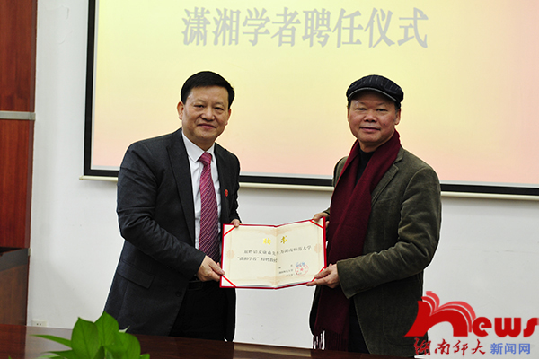 蒋洪新为麦康森颁发“潇湘学者”聘书。