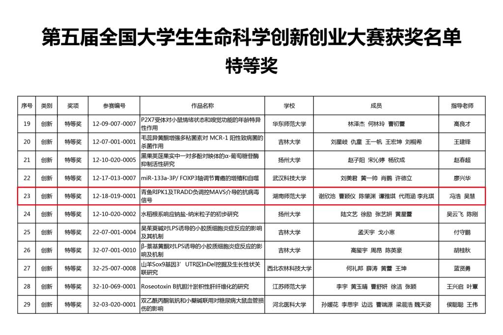 近日,第五届全国大学生生命科学创新创业大赛评审结果揭晓,英国365集团冯浩、吴慧指导,本科生谢欣池、曹颖仪、陈肇渊、谭雅琪、代雨涵、李兆琪的参赛作品“青鱼RIPKI及TRADD负调控MAVS介导的抗病毒信号”荣获特等奖。