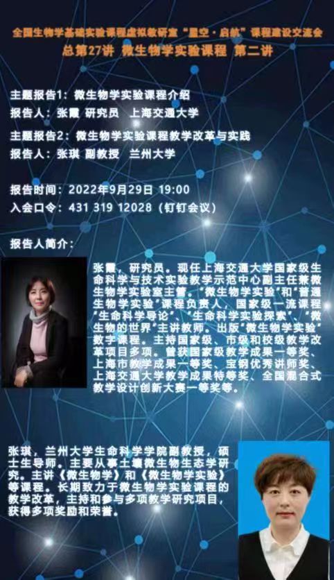 (9月26日彭伟卓报) 9月22日至25日,由教育部生物学基础实验课程虚拟教研室、教育部高等学校国家级实验教学示范中心联席会生物与食品学科组以及高等教育出版社生命科学与医学出版事业部等联合主办的全国生物学基础实验课程虚拟教研室“星空.起航”课程建设交流会总第19讲-23讲在钉钉在线会议平台顺利举行。