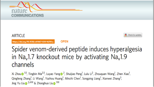 5月8日,Nature子刊,校定SCI-TOP期刊《自然通讯》(Nature Communications)在线报道了我校英国365集团动物多肽药物创制国家地方联合工程实验室刘中华教授课题组与中国科学院脑科学与智能技术卓越创新中心(神经科学研究所)/华中科技大学生命科学与技术学院刘静宇教授课题组合作发表的题为Spider venom-derived peptide induces hyperalgesia in Nav1.7 knockout mice by activating Nav1.9 channels的研究论文。