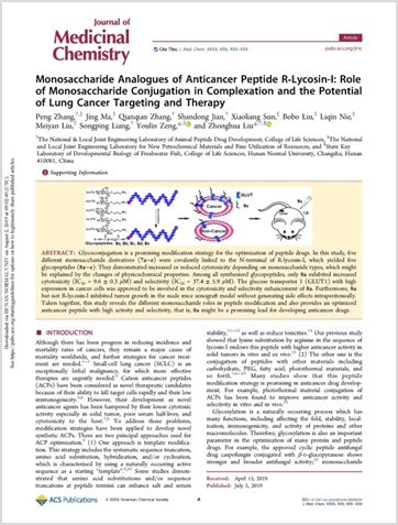 2019年7月5日,药物化学权威杂志Journal of Medicinal Chemistry(一区)发表我院动物多肽药物创制国家地方联合工程实验室刘中华课题组与化学化工学院曾佑林课题组合作完成的论文“Monosaccharide Analogues of Anticancer Peptide R-Lycosin-I: Role of Monosaccharide Conjugation in Complexation and the Potential of Lung Cancer Targeting and Therapy”以封面文章在线发。J. Med. Chem.是药物化学领域的顶级(top)学术期刊,2018-2019最新影响因子6.053。工程实验室张鹏博士与化学化工学院马婧硕士为并列第一作者,刘中华教授与曾佑林教授为本文的通讯作者。