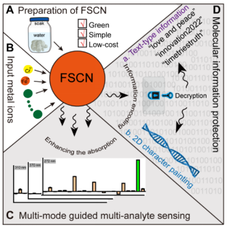 Scheme 1.(左)基于顺序合成双金属银铬纳米粒子的多通道传感、逻辑计算和三位一体的信息保护;(右)基于FSCN的金属离子多通道比色传感和高级分子信息保护。