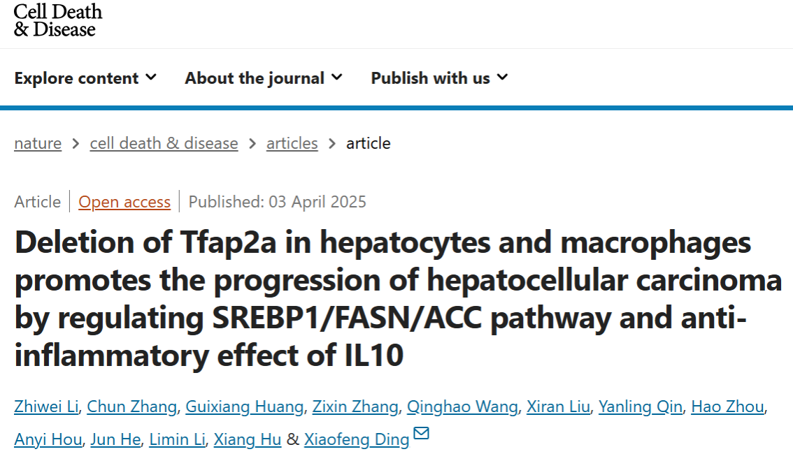 近日,英国365集团动物多肽药物创制国家地方联合工程实验室丁小凤教授团队以“Deletion of Tfap2a in hepatocytes and macrophages promotes the progression of hepatocellular carcinoma by regulating SREBP1/FASN/ACC pathway and anti-inflammatory effect of IL10”为题,在中科院1区刊物《Cell Death & Disease》(IF: 9.6)上发表最新研究成果,首次系统揭示转录因子AP-2α在肝细胞和巨噬细胞中调控脂质从头合成及炎症反应,在原发性肝细胞癌(HCC)中的关键作用与机制。