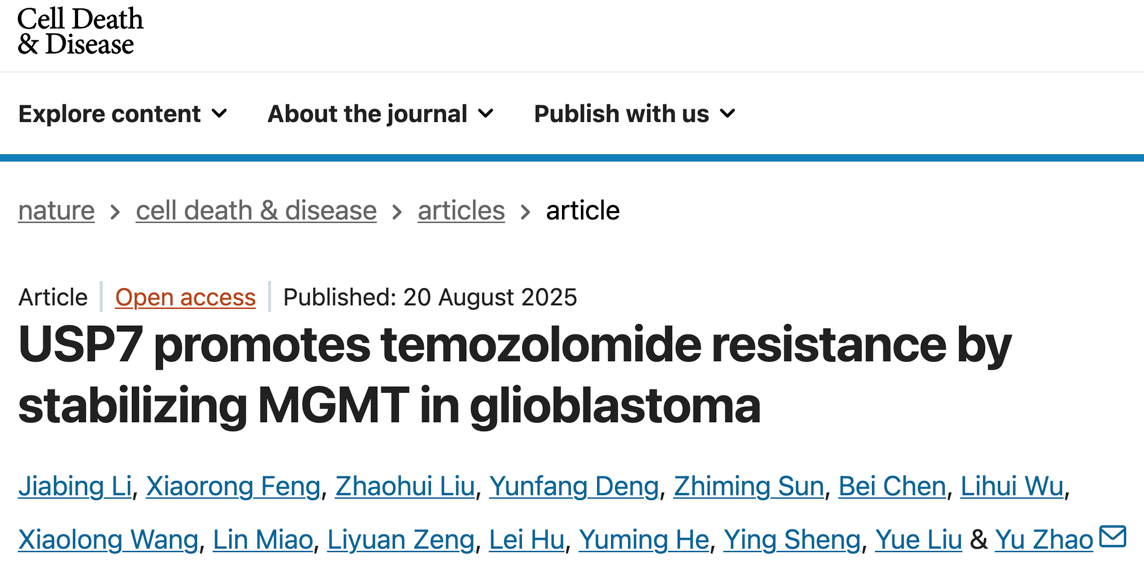 近日,365英国上市集团动物多肽药物创制国家地方联合工程实验室赵宇教授团队在自然(Nature)出版集团旗下的权威学术期刊、中科院JCR一区Top期刊《细胞死亡与疾病》(Cell Death & Disease, IF: 9.6)上发表了最新研究成果。该研究针对脑胶质瘤(GBM)的化疗抵抗难题取得重要突破,精准阐明了去泛素化酶USP7调控DNA损伤修复关键蛋白MGMT稳定性的分子机制,为逆转脑胶质瘤的化疗抵抗提供了新的策略和理论依据。