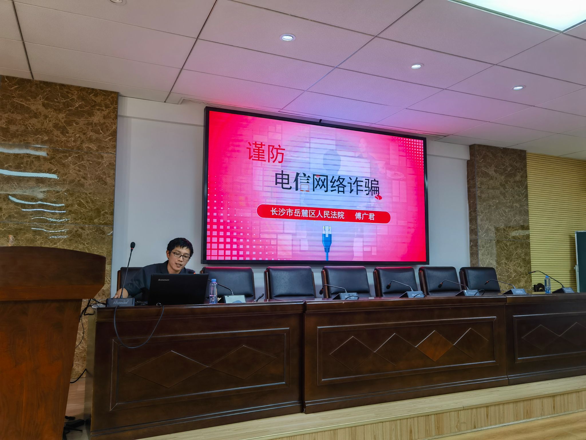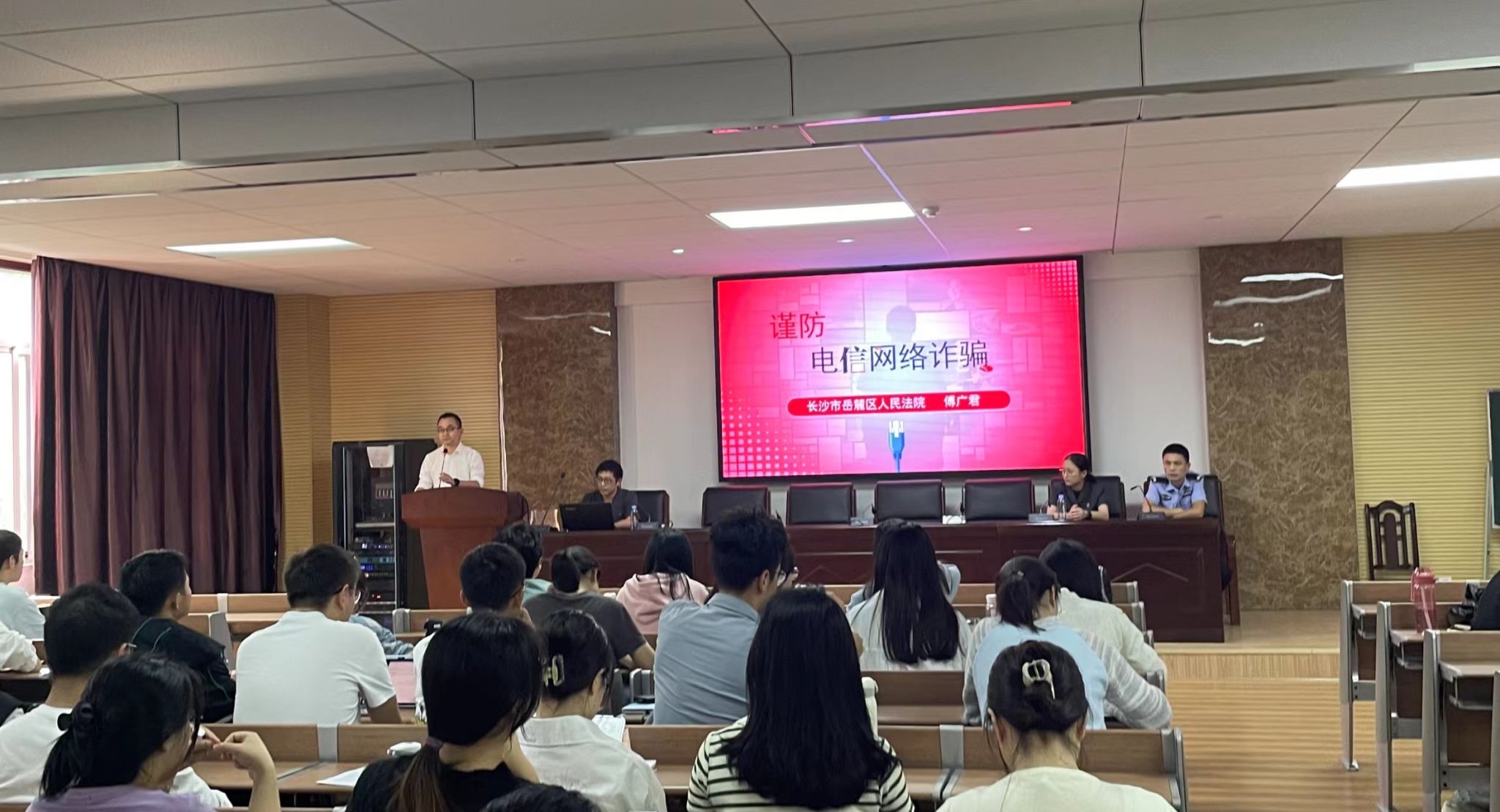 学院还特邀长沙市岳麓区人民法院的宣讲小组成员傅广君(岳麓区人民法院观沙岭法庭法官助理),周拔(岳麓区人民法院观沙岭法庭法警),喻娟(岳麓区人民法院观沙岭法庭书记员)对入学新生进行谨防校园电信诈骗的宣讲,为研究生的身心健康保驾护航。随着科技的发展,电信诈骗日益猖獗,给人们的生活和财产安全带来了严重威胁。我们应当保持警惕,提高自身的防范意识,科学辨别和识别电信诈骗,杜绝被骗上当的风险。