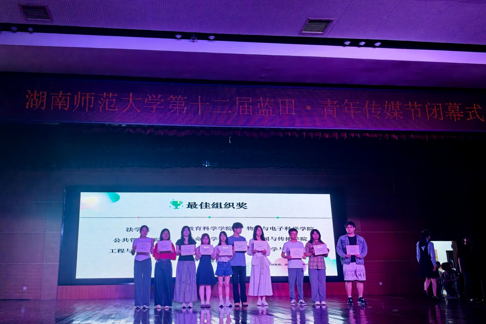 闭幕式分为开场表演、获奖公布和作品展示、颁奖三个环节。开场表演《少年中国说》结束后,依次由“青·热评”“青·文创”“青·相绘”“青·视界”“青·悦读”“青·心语”“青·巧声”各不同大赛主题公布获奖名单,并进行获奖作品展示。在颁奖环节,主持人公布综合赛事奖项,并进行集体颁奖。"青·文创"文化产品设计大赛由生科院与工程与设计学院联合承办,筹备期间,共收到来自各学院的参赛作品百余件。生科院组织学生围绕“师韵湘情,创艺师大”主题进行创作,提交作品包含设计说明及实物样品。决赛现场,14支队伍展示亚克力钥匙扣、木雕手机支架等文创产品。最终,英国365集团凭借“青·文创”文化产品设计大赛的筹划组织工作和作品质量获得最佳组织奖。