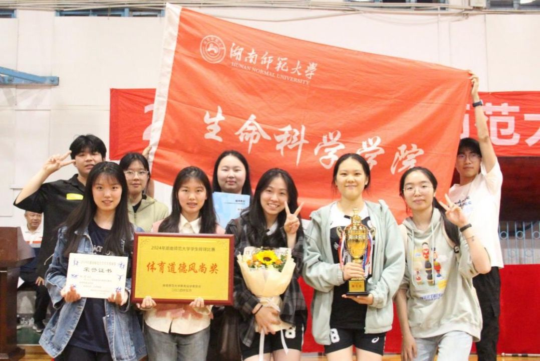 2024年6月,在校学生排球赛中,生科院女子排球队以“小组第一”的优异表现从小组赛突围,历经交叉赛、半决赛、排位赛的层层角逐,最终斩获第七名。球队凭借默契配合与稳定发挥,不仅展现出竞技实力,更以文明参赛风貌荣获“体育道德风尚奖”,诠释了“团结拼搏、文明竞赛”的体育精神。