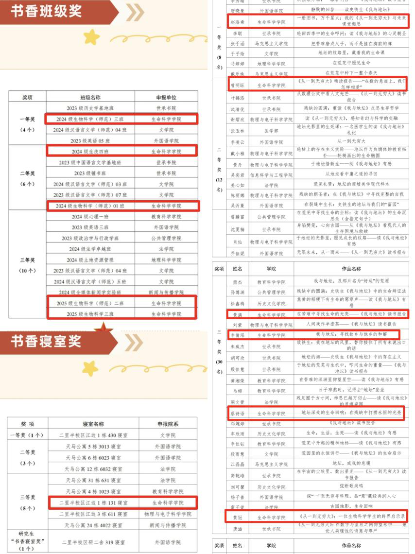 在本次“一校一书”活动中,共获14项荣誉。在集体奖项中,在本次 “一校一书” 活动中,学院师生凝心聚力、深耕阅读,共斩获 14 项荣誉佳绩,尽显书香育人成效。集体奖项方面,学院申报的《“书香寝室” 育人新模式的探索与实践》,凭借创新性的阅读推广机制设计与扎实丰富的活动组织经验,从众多案例中脱颖而出,成功荣获 “创新案例奖”。班级作为阅读推广的重要阵地,此次也涌现出一大批先进典型,24级生科三班荣获校级“书香班级奖”一等奖;24级生技四班、24级生科一班荣获校级“书香班级奖”二等奖;25级生科二班、25级生科三班荣获校级“书香班级奖”三等奖。