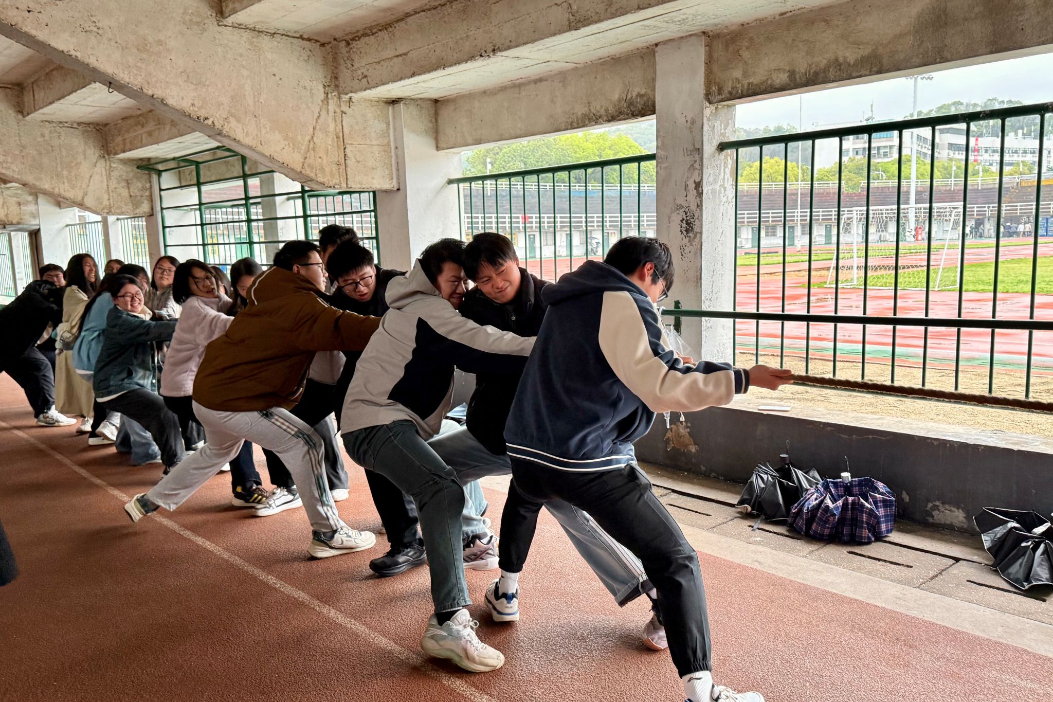 此次比赛共有5支队伍参赛,采用分组循环赛制,单场一局定胜负。比赛开展前,参赛队员抵达场地,明确分组站位后开展热身准备工作。工作人员同步完成比赛器材整理、比赛区域划定、观赛区域布置等工作,为比赛顺利进行做好保障。裁判哨声响起,比赛正式开始。参赛队员按赛前站位依次发力,保持身体后倾、重心压低的姿态,双手紧握长绳同步向后牵拉。比赛过程中,场边观赛同学持续呐喊助威,现场加油声不断。各参赛队伍严格遵守比赛规则,全程保持发力状态直至比赛结束,展现出良好的团队协作能力与竞技风貌。经过多轮角逐,2025级生科3班夺得冠军,赛后全体参与人员合影留念。