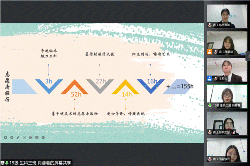 主持人李娟回顾了此次活动线上与线下的前期准备工作。青工部第二负责人蔡慧向同学们介绍了青工部成员以及青工部举办的特色活动。主讲人舒兰钧和优秀志愿者代表肖蓉蓉以自身经历为切入点,将志愿活动与个人收获紧密结合,与同学们分享了参与志愿活动的意义。宣讲会进行了问答与互动环节,同学们参与互动。19级辅导员李翠玲总结志愿活动的意义并表示:“志愿活动是纯粹而热忱的,在给别人帮助的同时还能使自己得到成长,所有的努力都不会被辜负,付出终会有回报。”