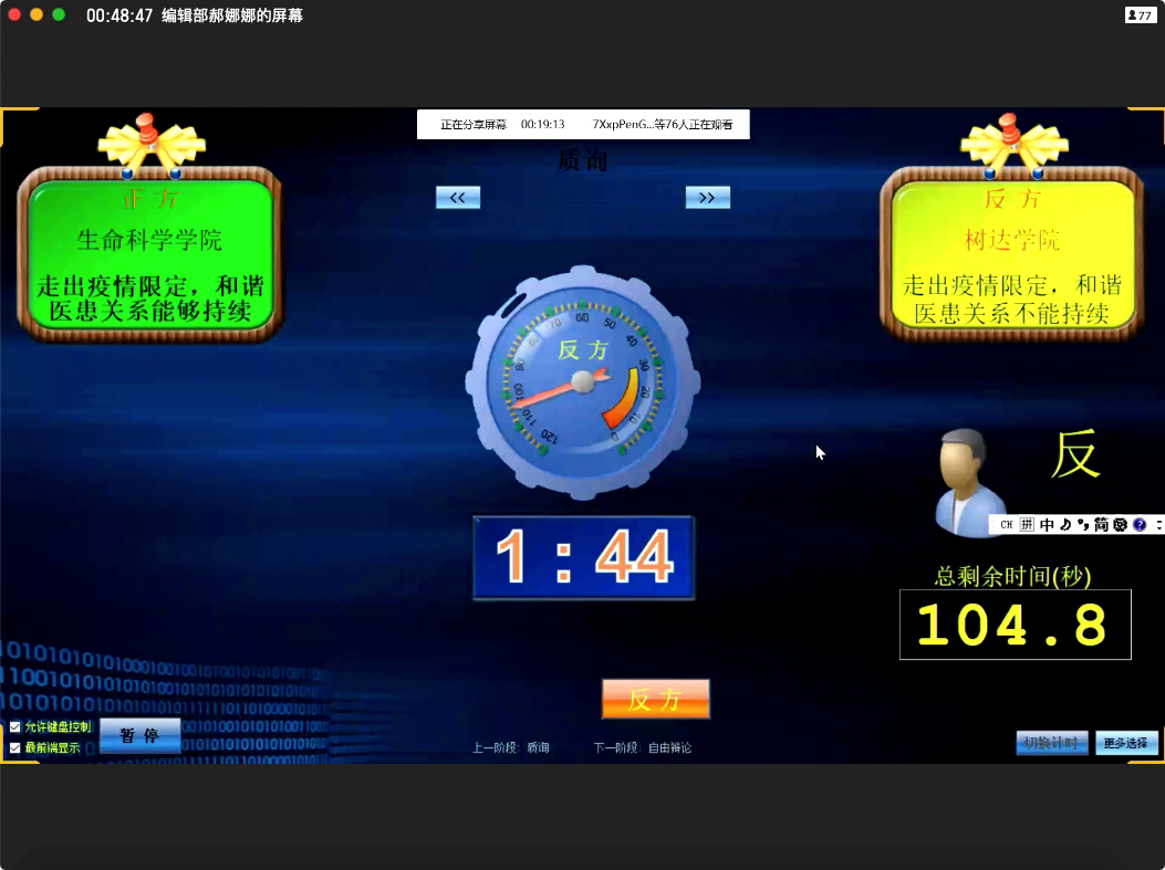 评论员们针对“国内外疫情防控措施对比”以及“疫情下留学生的处境”两大热议话题展开了讨论。在辩论表演赛环节,两院辩论队就“走出疫情限定,和谐医患关系能否稳定?”这一辩题展开了辩论,正反双方从原因、解决措施、影响等方面各抒己见,将评论会气氛推向高潮。分享环节,两院的评论员分别推荐了《只有医生知道!》和《论不服输》两本书籍。