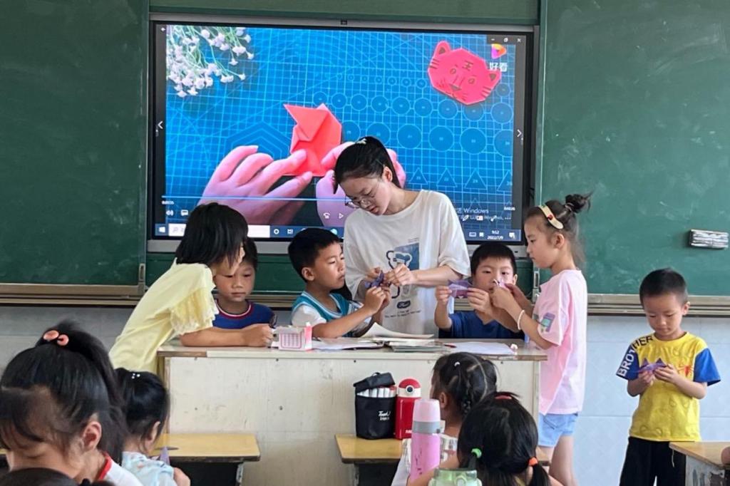在活动中,饶瑶婷向学生们介绍了折纸的用途,通过视频播放等方式展示了折纸作品的制作方法,并现场示范指导学生们进行创意手工活动。在近一个半小时的时间里,学生们互帮互助,认真参与,学习氛围活跃。