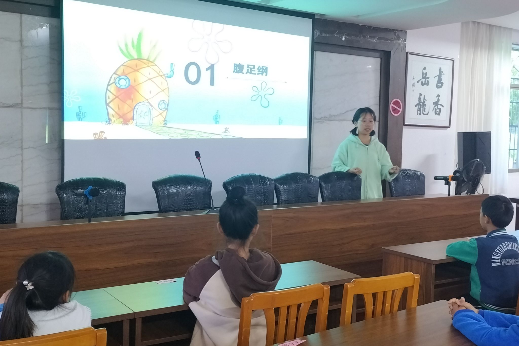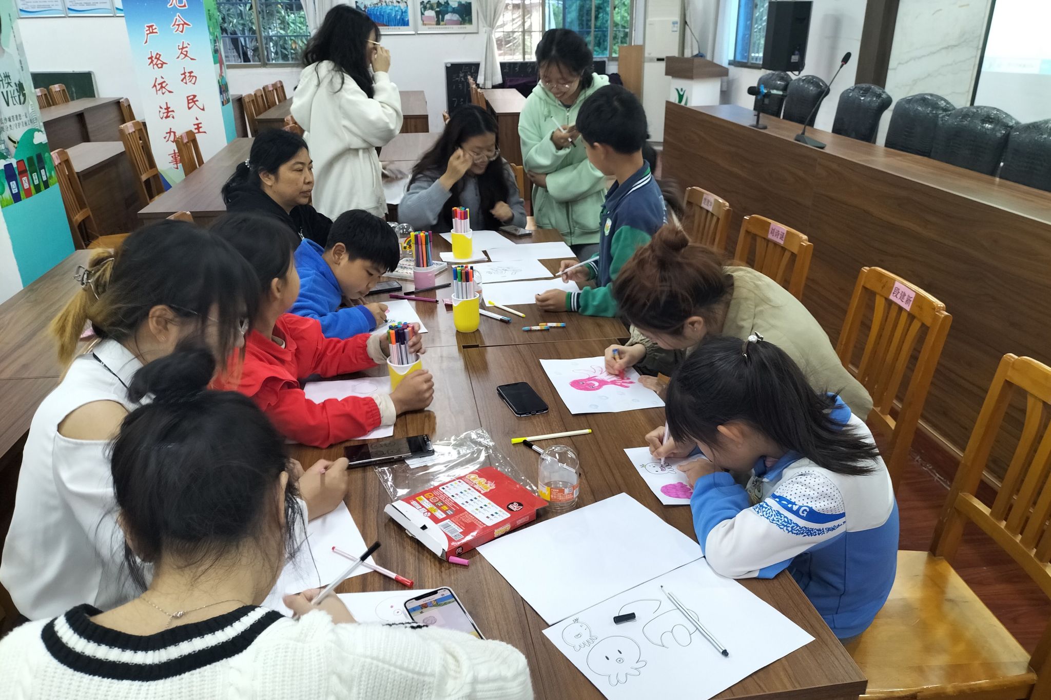 此次活动分为知识讲解和创意绘画两部分。彭雅智通过文字与图片相结合的方式,向小朋友们讲解了软体动物的相关科学知识,并与小朋友交流互动。志愿者们为小朋友分发纸张、彩笔等绘画工具,并协助小朋友绘制软体动物的简笔画。小朋友们选择想要绘画的动物,在志愿者的提示下绘出动物的外形特征并涂上颜色。活动结束后,志愿者们与小朋友合影留念。