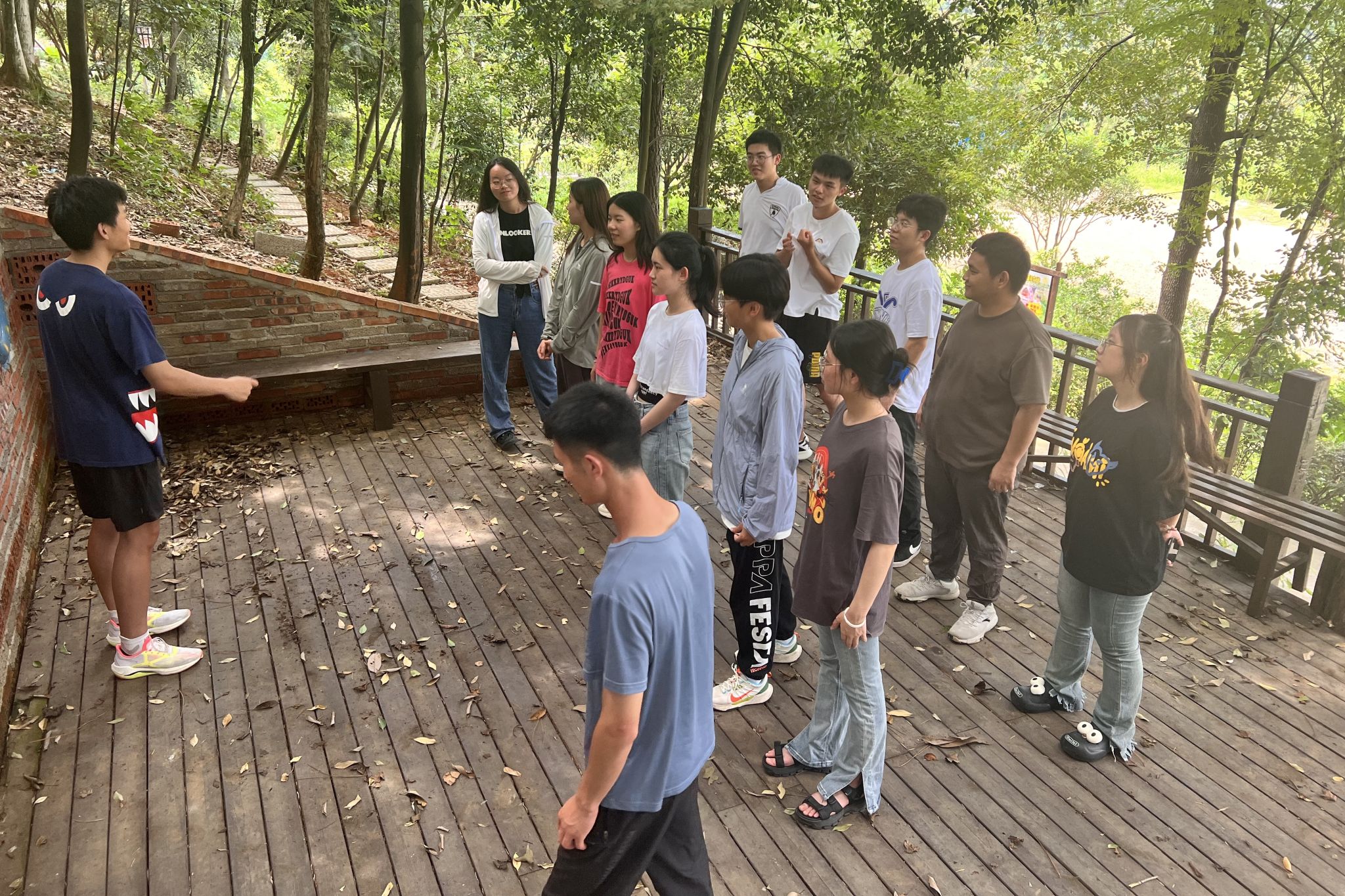谭益水进行如立正稍息、向右看齐等场控口令示范,并让场控组成员出列练习口令指挥。他表示,场控组各成员口令需要短促有力、清晰明了,各成员指挥时需要自信挺拔,同时实践队成员都要有控场意识,便于课程有序地开展。随后,谭益水组织场控组成员依次出列指挥提前准备好的室外游戏,包括“攻城”、“贴膏药”、“老鹰捉小鸡”以及“抱团取暖”。指挥活动结束后,谭益水向参加培训活动的成员表达感谢,并提醒场控组成员及时上交室内和室外游戏策划案。