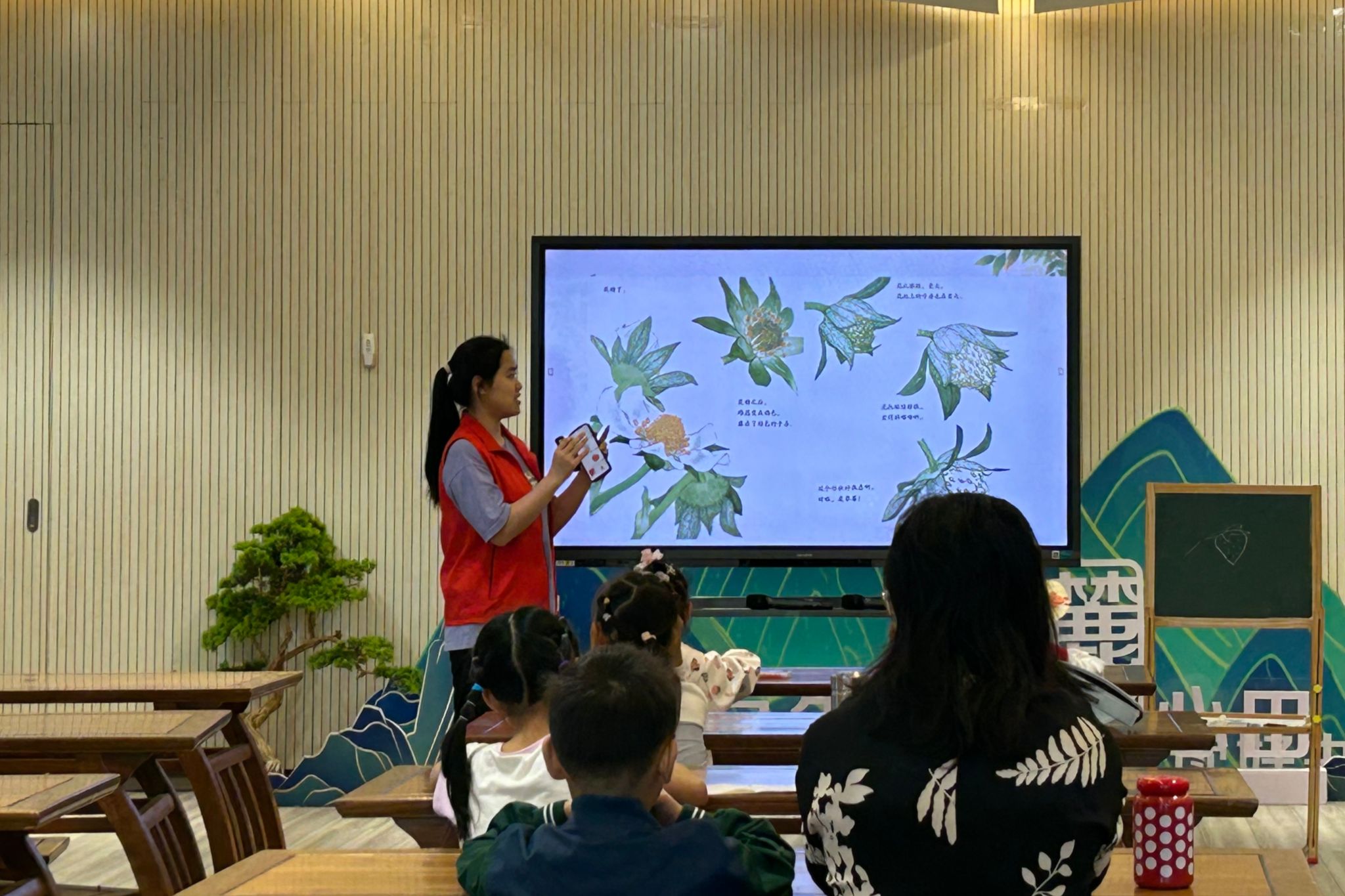 此次活动分为植物相关知识科普,植物重要性介绍以及压花书签制作三个环节。主讲人以生活中常见的水果——草莓为切入点,讲解了草莓的大小、形状、颜色和果实等方面的特征,向小朋友们解释草莓呈鲜红色,花朵通常为白色且果实是由花托膨大而成的聚合果。同时,主讲人列举适合用来做书签的植物,如玉兰叶、桂花叶、银杏等,并以看书签猜植物的方式与小朋友们互动。此外,志愿者协助小朋友们辨认植物,帮助他们发挥想象力、制作树叶书签。小朋友们将上台展示手工作品,与志愿者和小伙伴分享设计灵感。