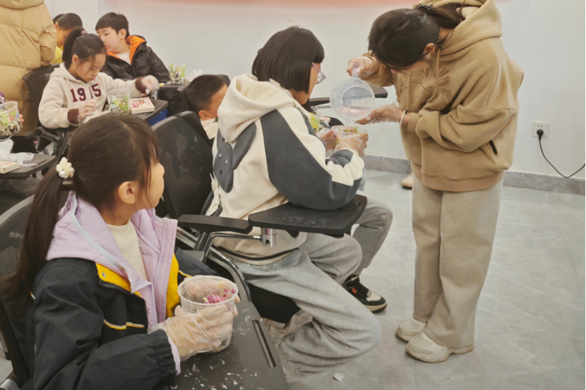 此次活动包括水仙花知识科普、知识竞答、水培水仙花三个部分。贺橙子以水仙花传说引出主题,通过音乐激发小朋友们的学习兴趣。她向小朋友们介绍了水仙花的花语、气味和颜色,并讲解了水仙花的栽培方法及栽培注意事项。例如,剥去鳞茎的外表皮使之露出花芽,培养过程中水必须保持清洁等。她还设计了有趣的知识竞答环节,通过发放奖品的方式鼓励小朋友们积极参与课堂互动,活跃课堂气氛。随后,志愿者们为小朋友们分发贴纸、假花、水仙种球和咖啡杯等相关材料。志愿者们为小朋友耐心解答栽培过程中遇到的问题,帮助他们完成独特的水仙花生态瓶作品。