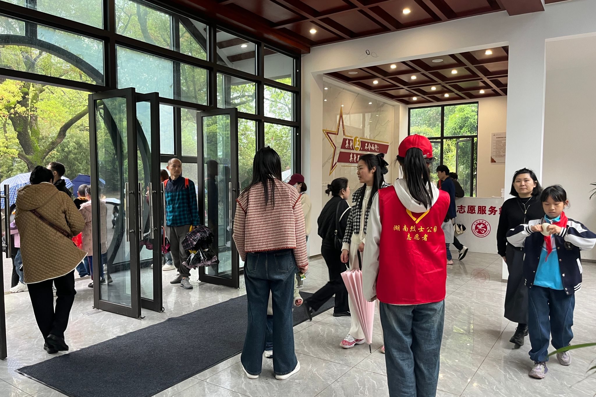 志愿者在大厅维持秩序