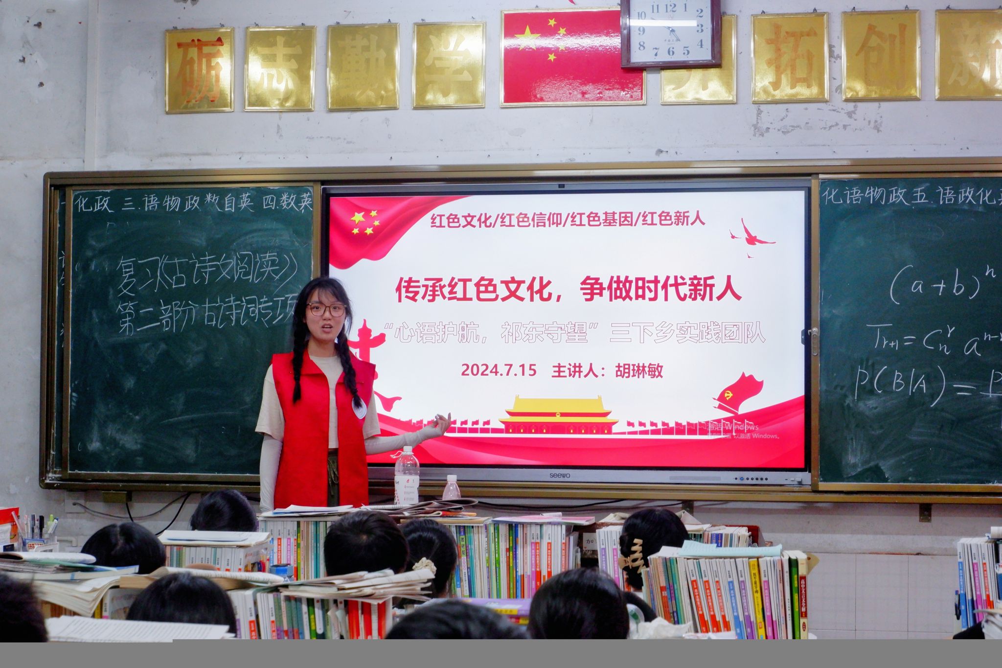 (通讯员 田灿 胡琳敏 谭雯婧)7月15日下午,英国365集团“心语护航,祁东守望”三下乡实践团队于祁东二中举办“传承红色文化,争做时代新人”主题活动。宣传组组长胡琳敏担任主讲人。