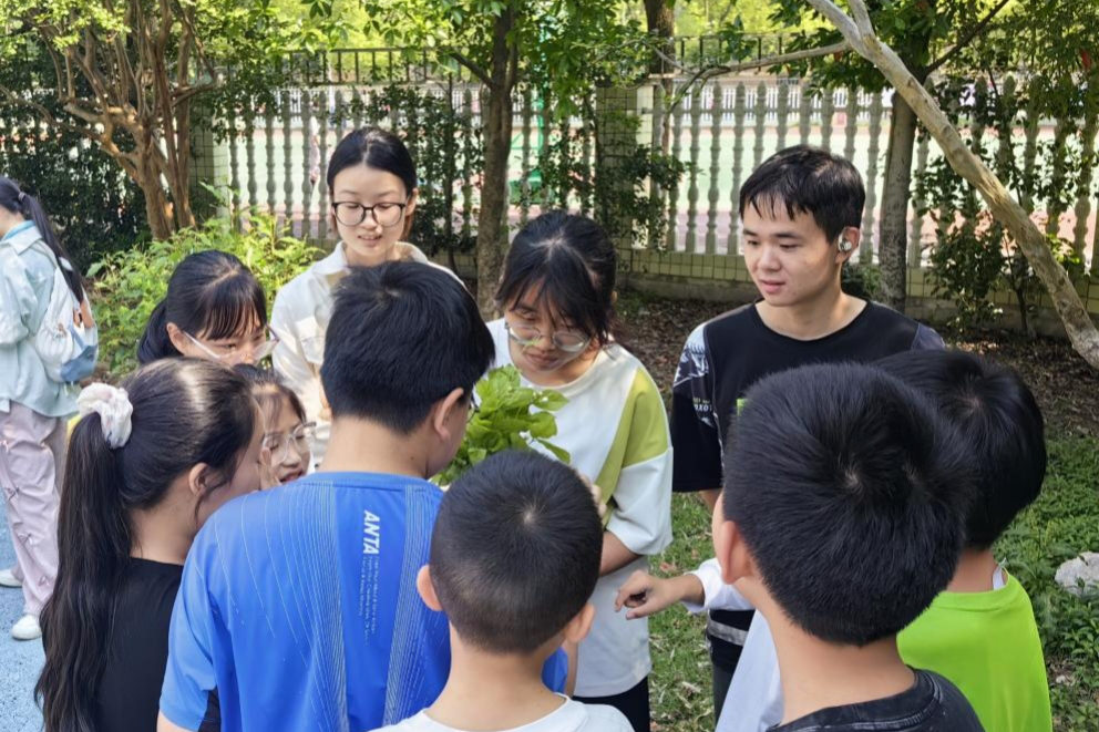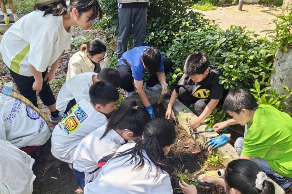 志愿者组成科普服务队伍,面向中高年级小朋友,运用专业知识开展科普实践类活动。此次活动包括实地种植和科普教育两部分。活动时,每五名志愿者组成一个小队,带领小朋友们动手种植包括茉莉花、太阳花、爬山虎在内的多种植物,并且在种植过程中为小朋友讲解植物知识。种植活动结束后,志愿者和小朋友们进行每周的后期维护工作,定期为花草杀虫、施肥。志愿者们组建家长群,便于小朋友打卡自己的观察维护成果。此外,志愿者和小朋友共同设计项目告示牌和植物科普卡,向周边居民进行活动宣传并且科普植物小知识。