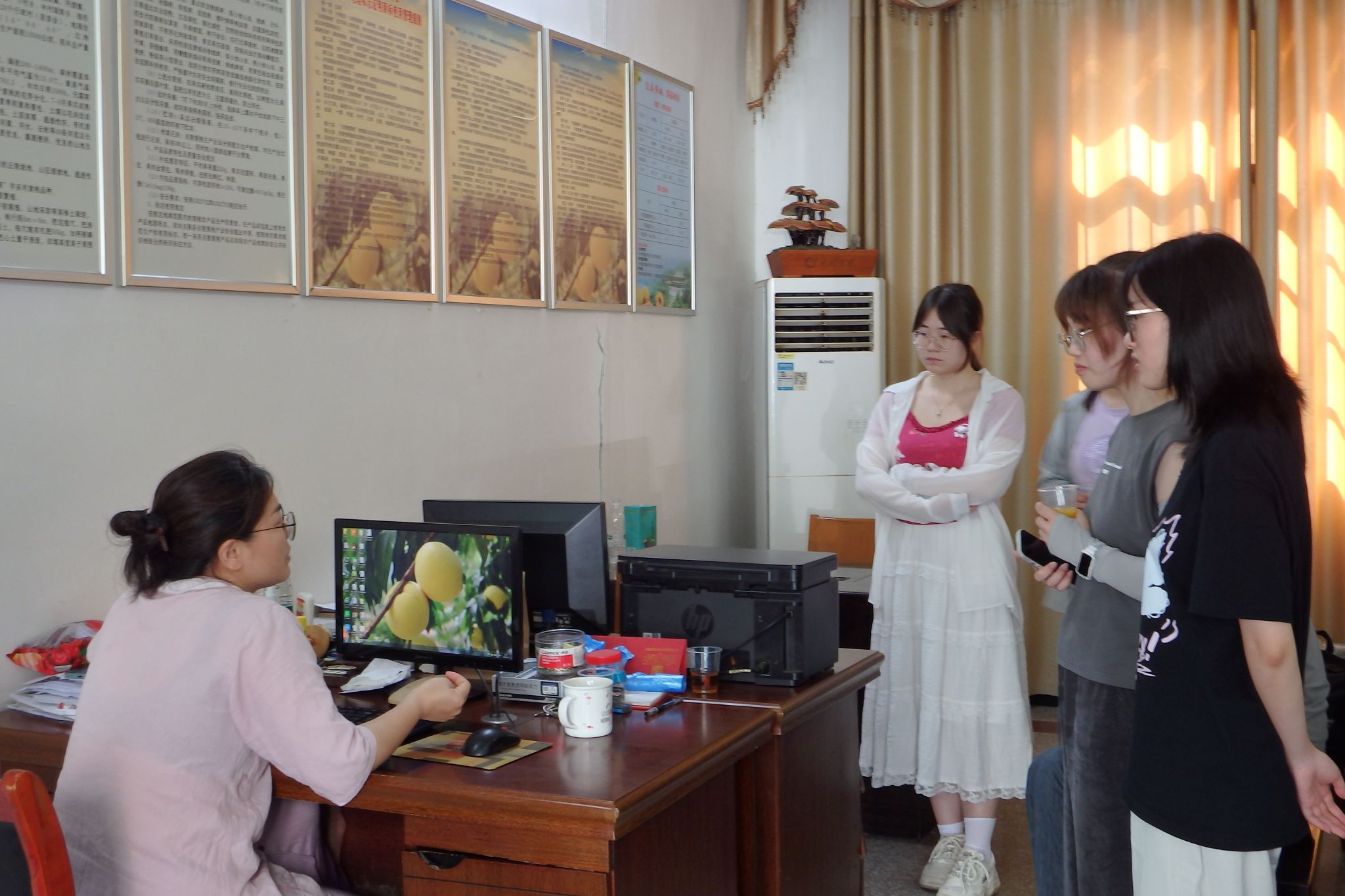 黄远太介绍炎陵黄桃产业发展历程、显著优势、创新举措以及当前面临挑战的。针对产业的持续发展,黄远太特别说明协会在人才培养方面的创新实践,提出采用“农业+电商”的培训模式,将传统的种植技术与现代电商营销技能深度融合,培养出大批黄桃产业领军人才和电商运营能手。随后,实践团成员与协会的核心工作人员谭美林进行补充采访交流,进一步了解协会产业服务的细节,并进行合影留念。