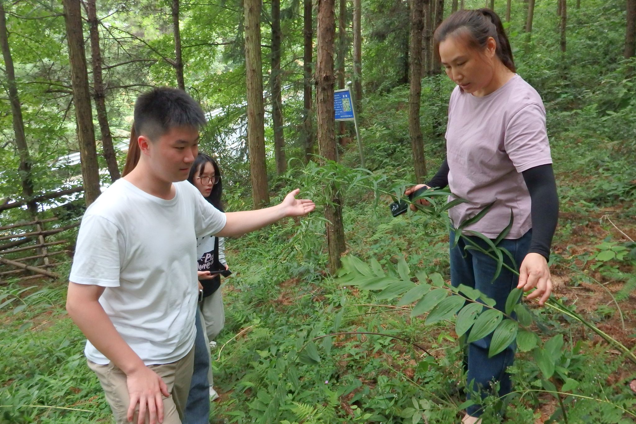 王长庚向实践团成员介绍,麦芽药业有限公司作为炎陵县中药材产业的龙头企业,已建成4个种植基地,总面积超过7000亩,主要种植黄精、玉竹、山苍子等中药材。实践团了解到该公司采用“公司+合作社+农户”的合作模式,回收农户种植的药材,带动当地农户增收致富。此外,企业还探索“中药材种植+研学+产品开发+文旅”融合模式,规划建设“百草园”项目,推动中医药文化与康养旅游结合。同时,王长庚提到当前存在劳动力短缺、中草药种植加工投入大等问题,表示将通过政策支持与多方协作予以解决。随后,实践团前往公司黄精种植基地进行考察。基地负责人介绍黄精的种植技术、生长周期及药用价值,并展示采用科学管理和标准化种植的实际情况。现场观察显示,黄精植株生长状况符合种植标准,药材品质保持稳定。