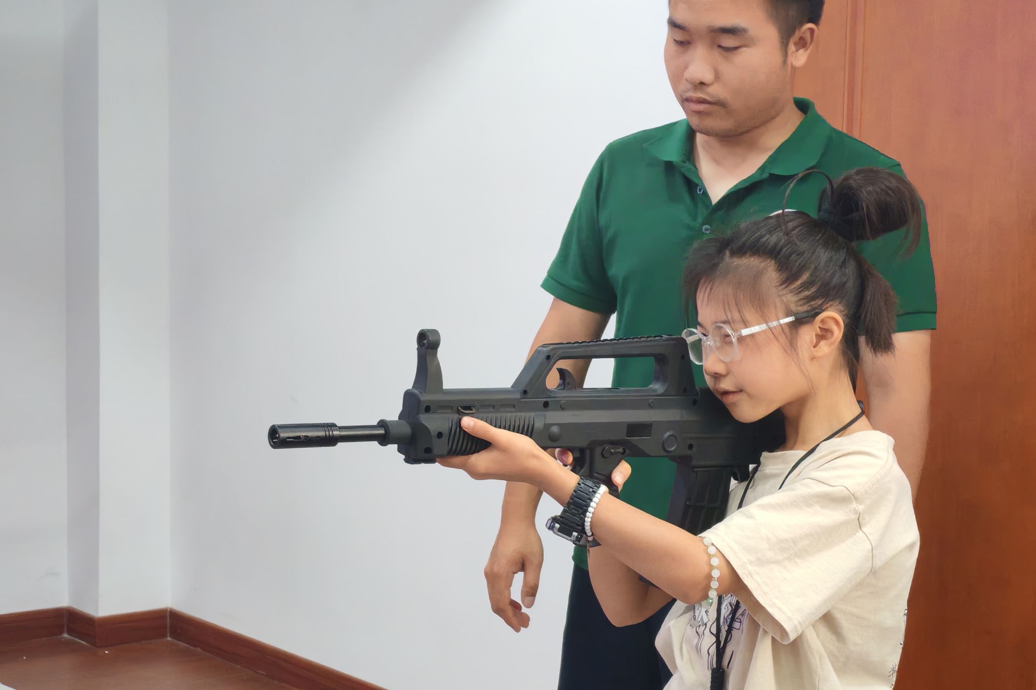 活动伊始,教官向同学们讲述“国无防不立”的含义,通过启发式提问,例如枪如何实现连发等问题,引导同学们思考枪支的设计智慧。同学们感受国产QBZ95-1式自动步枪这一国防重器的枪重,从中体会到军人持枪的艰辛。在讲解正确持枪姿势环节,教官亲身示范——稳固握把、自然抵肩、贴腮瞄准。同时,教官运用军事专业知识,对枪械背后的国防科技与战术体系进行拓展,启发同学们爱国情怀。在教官的组织与指导下,同学们分批有序进入模拟射击区域,按照标准姿势持“枪”并扣动扳机,瞄准电子靶,通过屏幕上激光落点实时反馈和语言播报的靶分数了解自身精准度。