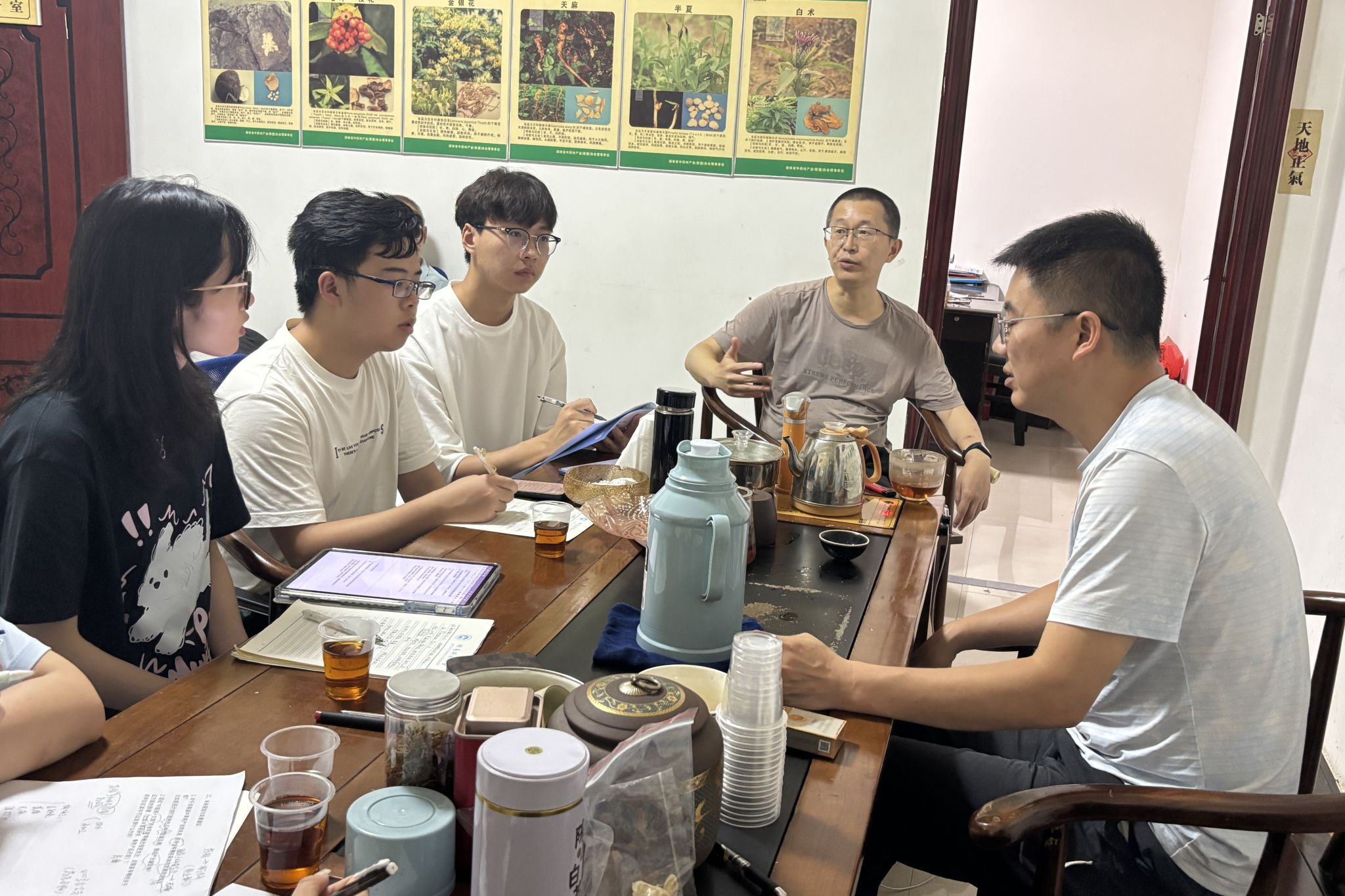 实践团队围绕炎陵县中草药产业发展,与黄肖勇、何亮展开深入交流,系统了解产业种植分布、经营模式及现存问题。黄肖勇介绍,炎陵县13个乡镇均有中草药种植,其中五六个乡镇已形成规模,种植品种以黄精、金银花为主,主要分布在海拔、环境适宜区域。当地多采用“公司+农户”模式:由公司向十多家合作农户提供种苗、技术并回收产品,通过线下药店以农副产品形式销售。实践团从中了解到种植的现存问题:种植品种生长周期长;多数药材因缺乏加工资质难以大规模售卖;恶劣天气的影响。交流中,何亮向实践团补充了产业面临的困境:资金、人才短缺,且尚未成立中药材产业协会,当地药学会仅负责药店专业知识与政策培训,缺乏种植指导等职能。