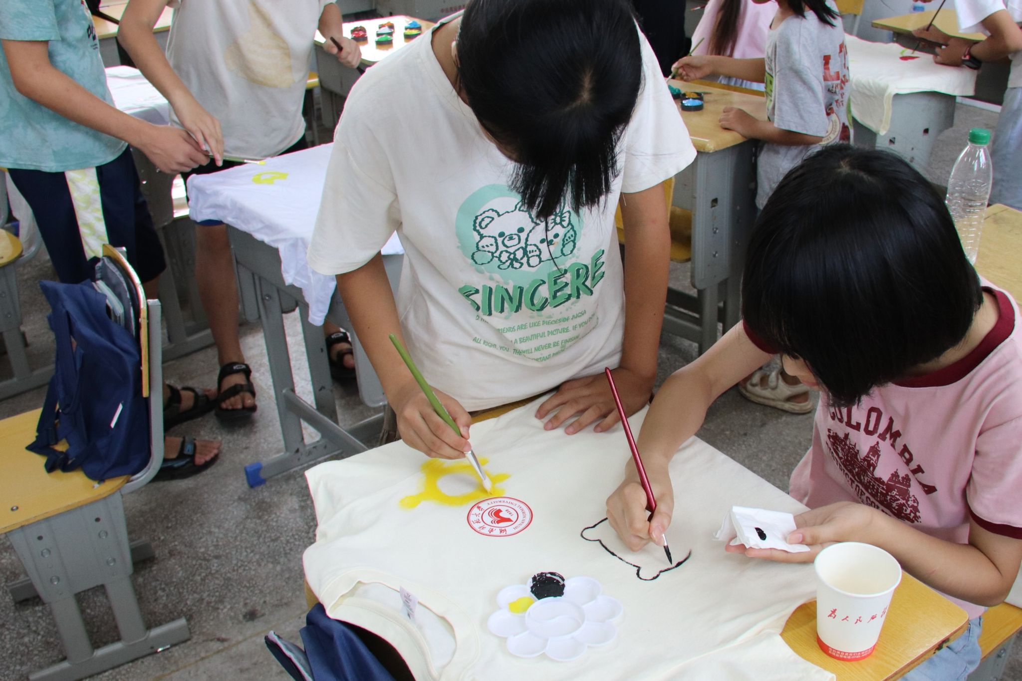 随着暑期支教临近尾声,实践团策划此次活动,邀请孩子们在队员的队服上进行自由创作。活动开始前,负责人向孩子们介绍活动流程与创作形式,引导他们通过画笔传递想法。孩子们有序领取画笔后,在队服上勾勒出太阳、花朵、笑脸等图案,部分孩子绘制了与队员们相处的场景。队员们则指导孩子们调整绘画位置,解答创作中遇到的问题。队员们与孩子们交流配合,完成队服的创作,使双方对支教期间的相处时光有更具体的感知。孩子们表示,用画笔在队服上留下印记,既能记录下这段相处的时光,也让他们在绘画过程中表达心中的想法。