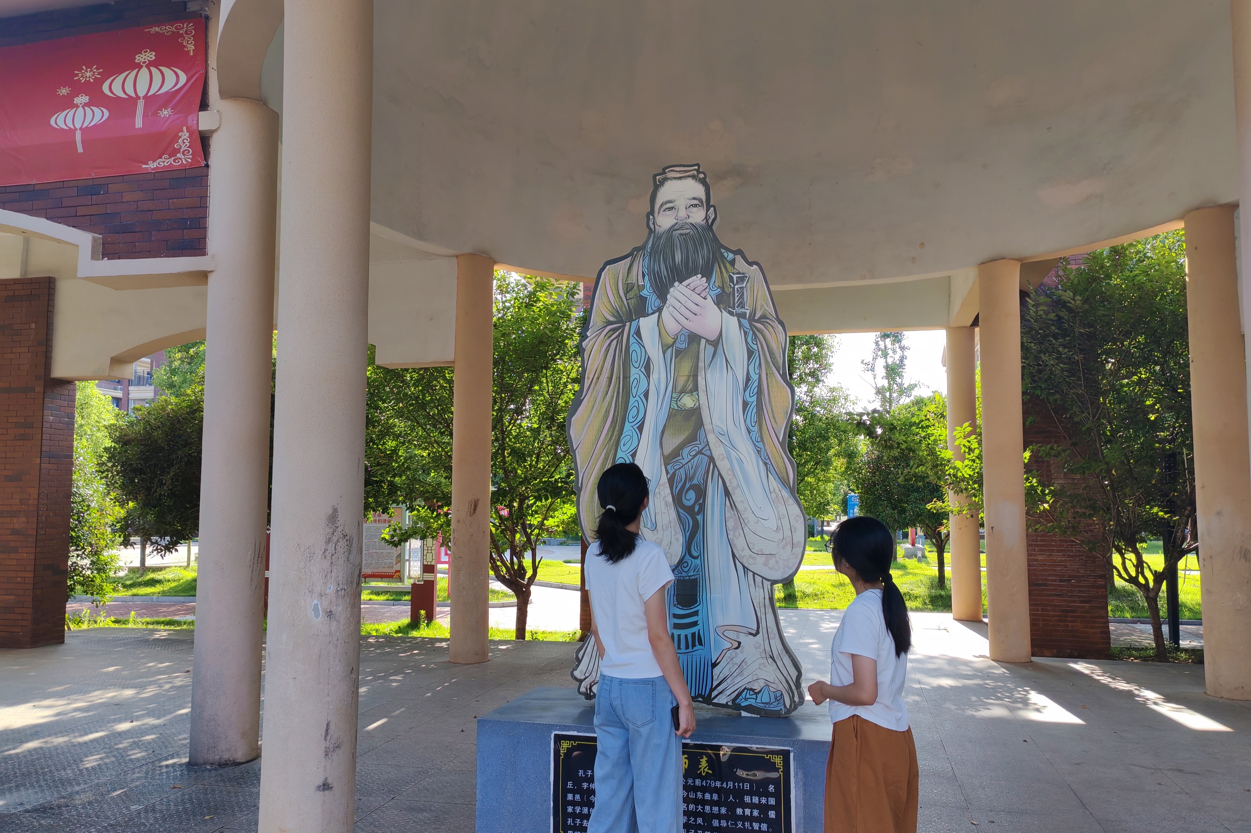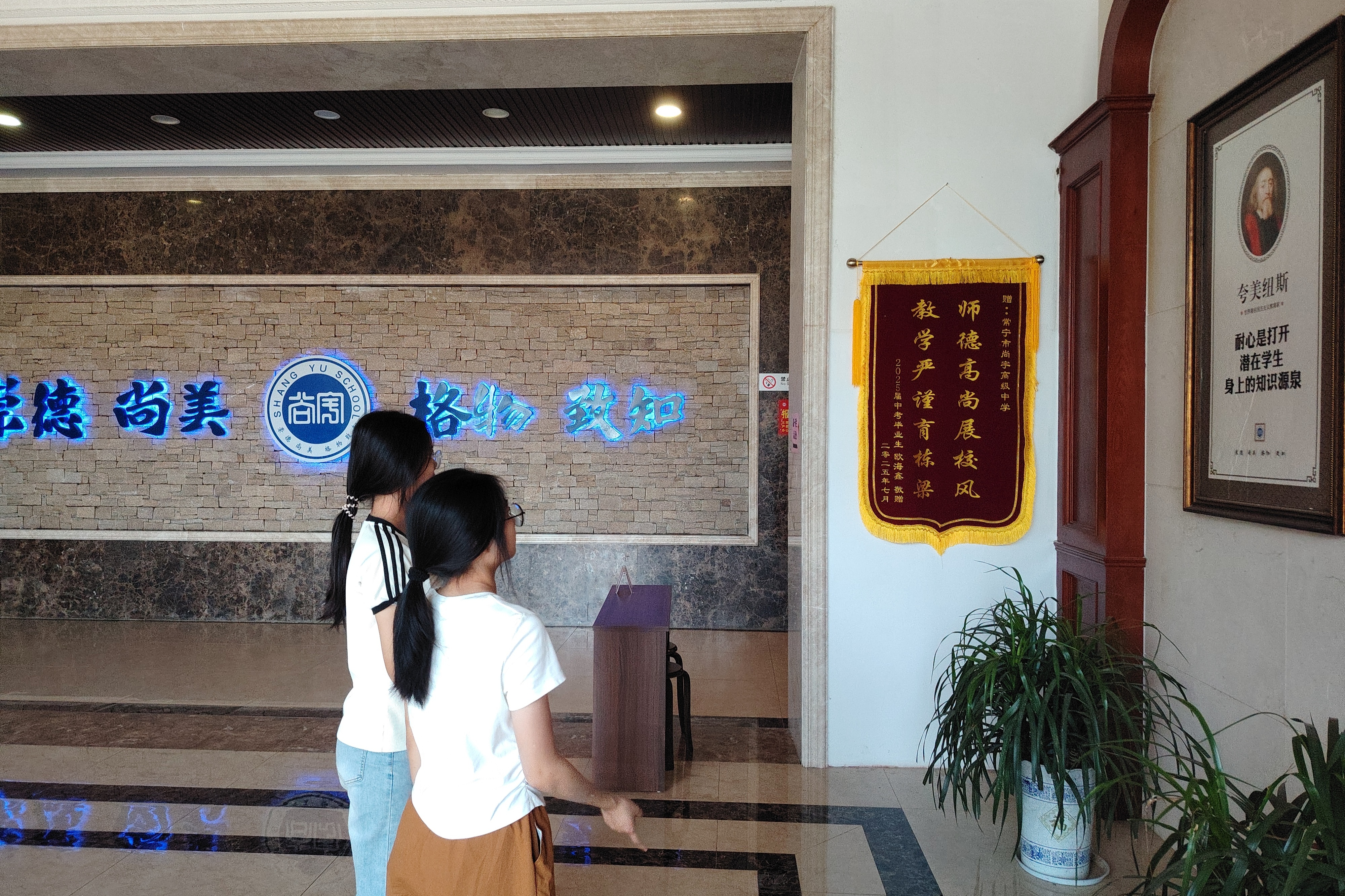 实践团成员参观尚宇楼及校园各区域,直观了解学校办学理念与教学环境。在尚宇楼大厅,“崇德”“尚美”“格物”“致知”的八字校训清晰呈现,成为学校办学理念的直接体现。成员们行进至国学文化广场的过程中,校园内植被覆盖均匀,地面保持整洁。广场长廊可供学生课后休憩交流,周边的篮球场、乒乓球桌及田径场等运动设施,为学生提供了多样化的锻炼空间。随后,成员们分别参观小学部、初中部、高中部教学楼,各楼栋长廊展示的优秀教师名单及学生风采立牌。这些展示内容系统呈现了学校教师队伍的整体水平,同时也直观反映出日常教学工作取得的实际成果。