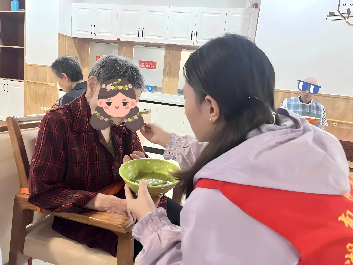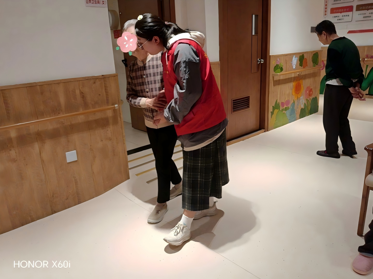 在活动正式启幕前,志愿者团队率先完成系统化岗前培训。培训内容围绕认知症核心照护要点展开,涵盖认知症的病理特征与行为表现、适配性沟通技巧、服务场景安全规范,以及突发状况的标准化处置流程,为后续服务筑牢专业基础。培训结束后,志愿者依据分工分组投入服务。其中一组志愿者采用“一对一”陪伴模式,倾听长者分享人生过往与日常点滴,在交流中搭建情感联结;另一组则聚焦行动不便的长者,或协助其沿院区步道缓慢漫步、感受环境,或在活动室陪伴观看电视节目,并以轻松话题开展互动。用餐时段,志愿者与护理人员紧密协作,为有进食困难的长者提供帮助,包括适配餐具的递送和食物的分份递送等。