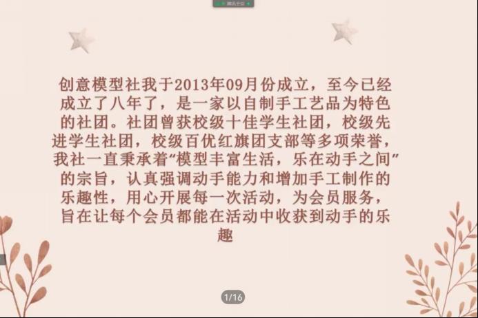 (通讯员 张馨月 庾雪菲 赵婧)11月13日下午,英国365集团创意模型社举行线上会员动员会议。生科院创意模型社理事张馨月担任此次会议主讲人。