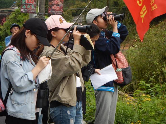 5月12日上午8点,上山实习课程正式展开。动物课程学习组同学在老师的带领下进入山林寻找鸟类,通过辨别鸟类的叫声和外形,判断鸟类的类别。另一组同学则对路旁昆虫的外观进行观察,并利用分配的工具进行捕捉,为制作标本提供材料。植物课程学习组的同学则在老师的带领下学习植物的特征性状并进行采集。下午2点30,同学和老师一起在风雨长廊对收集的植物进行分类检索和挂牌。