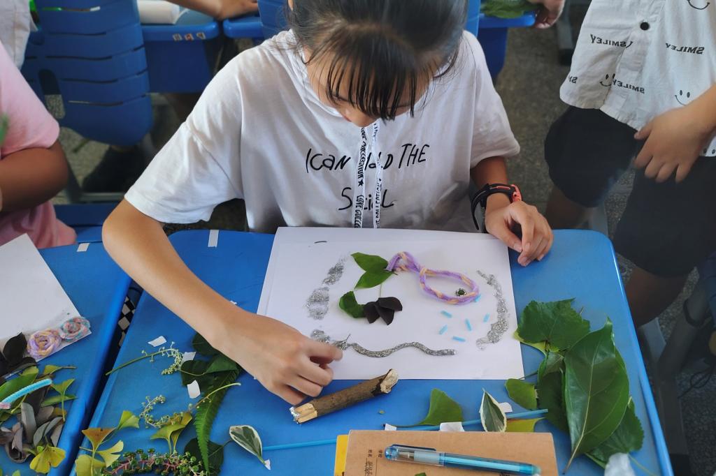 此次活动仅在五年级开展,分为户外植物采集、植物画创作讲解、植物画制作及作品展示四个环节。社团成员宁琦以及张贝贝带领学生在校园内采集植物。学生在张贝贝的讲解下,完成植物创意画的制作。老师展示学生作品并为学生拍照留念。