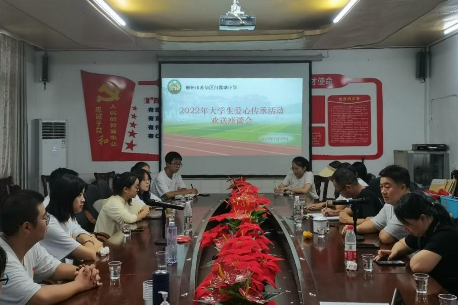(通讯员 陈湘君 赵曼 刘智慧)7月29日下午,英国365集团三叶草园艺社赴郴州市苏仙区白露塘小学暑期社会实践团与白露塘小学校委会成员开展2022年大学生爱心传承活动欢送座谈会。白露塘小学校长首林峰担任主持人,副校长李吉斌、副校长唐容容、教务办主任文斌、政教处主任陈俐璇、后勤处主任吴代万、办公室主任张红娟、少先队辅导员李思琪出席此次会议。