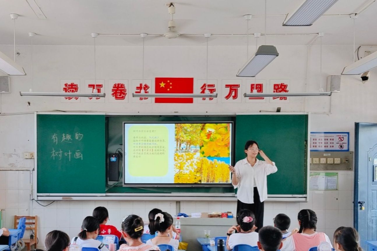 此次课程在一年级、四年级、五年级开展,包括趣味美术课、音乐课和户外体育课。王妍在趣味美术课堂上,为学生讲解不同树叶的特点,引导学生根据树叶不同的形态特点完成树叶画。孙亚茹带领学生欣赏不同风格的音乐歌曲,并教唱《外婆桥》、《起风了》两首歌曲,让学生进行分组练习并展示学习成果。周佳倩带领学生进行体育锻炼,开展趣味篮球赛,让学生在运动中要发扬体育精神。