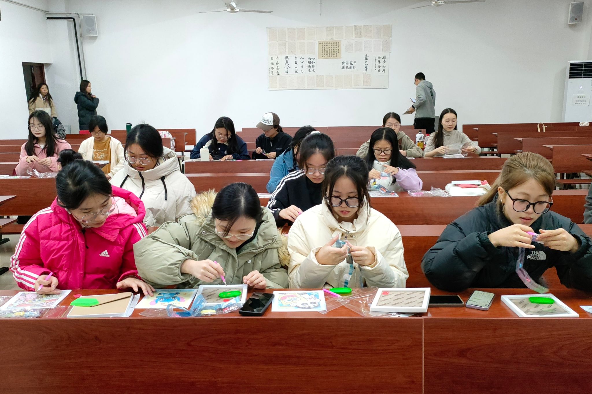 活动分为理事介绍贴画和会员动手操作两部分。理事以ppt及视频的方式向大家展示活动材料,讲解并示范水晶钻石画的制作步骤、基本技巧和注意事项。理事将钻石画材料包分发到会员们手中,会员按照制作流程积极参与钻石画的制作,在完成作品的过程中体验动手的乐趣,并且主动将自己完成的钻石画拍照上传,参与社团活动评奖。会员们表示,此次活动简单有趣,钻石画的合作完成拉近了彼此之间的距离,同时他们也对下次社团活动充满期待。