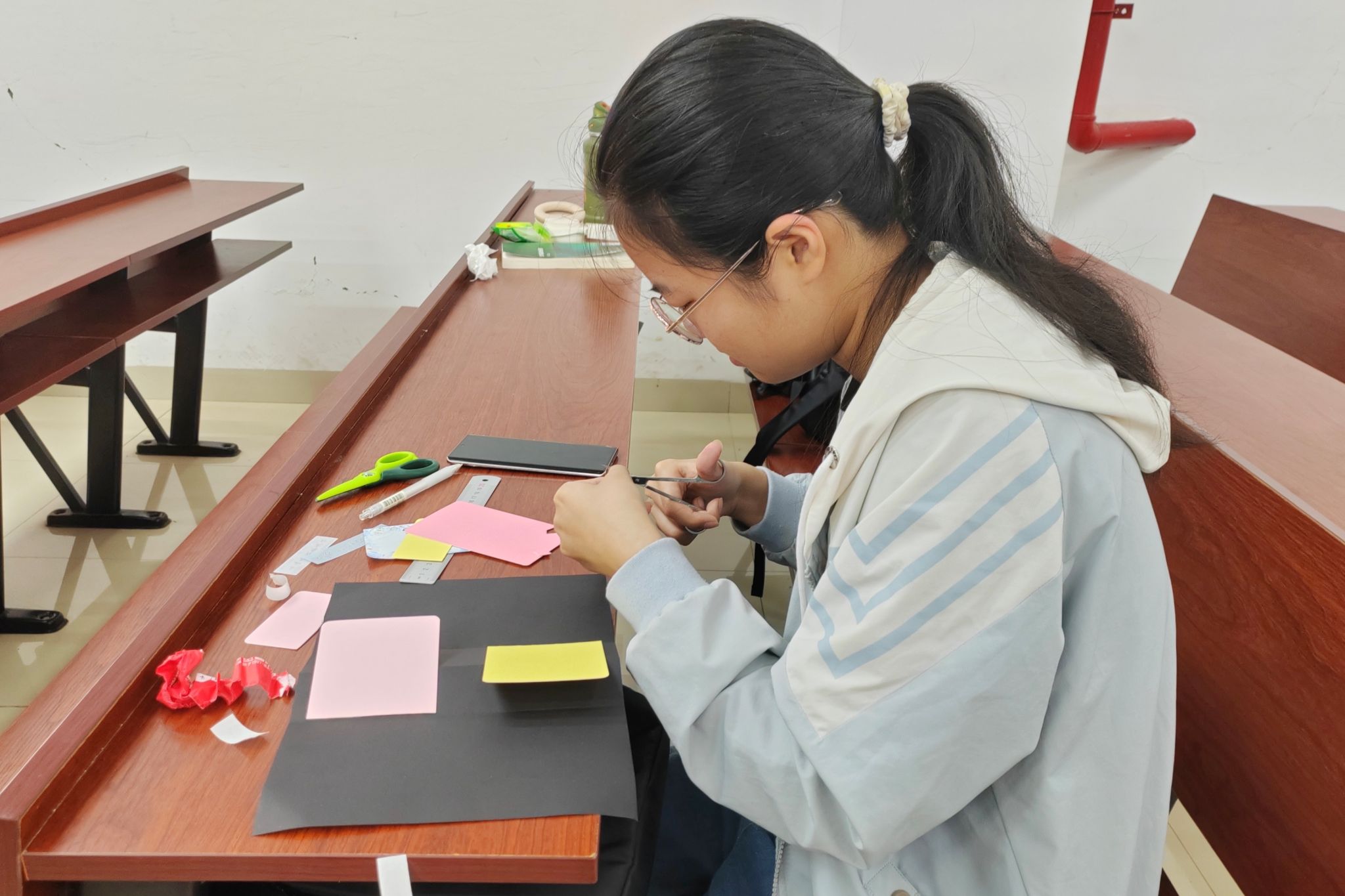此次活动分为材料筹备、主讲人讲解、会员创作和作品展示四个部分。社团负责人根据制作需求筹备活动材料,收集活动人员名单,购买相应人数的彩色卡片、双面胶、贴纸等。孙亚茹为同学们讲解卡片的制作流程,如确定卡片主题、收集相关素材、设计卡片布局、编写卡片内容等,并介绍手工卡片所蕴含的情意,提示同学们可使用做贺卡的方式在上面书写文字。此外,她提醒同学们材料的种类多样,可共同利用相互传借。同学们利用创造性思维,结合网络图案进行卡片制作,并通过将完成的作品拍照上传到群相册的方式来展示成果。