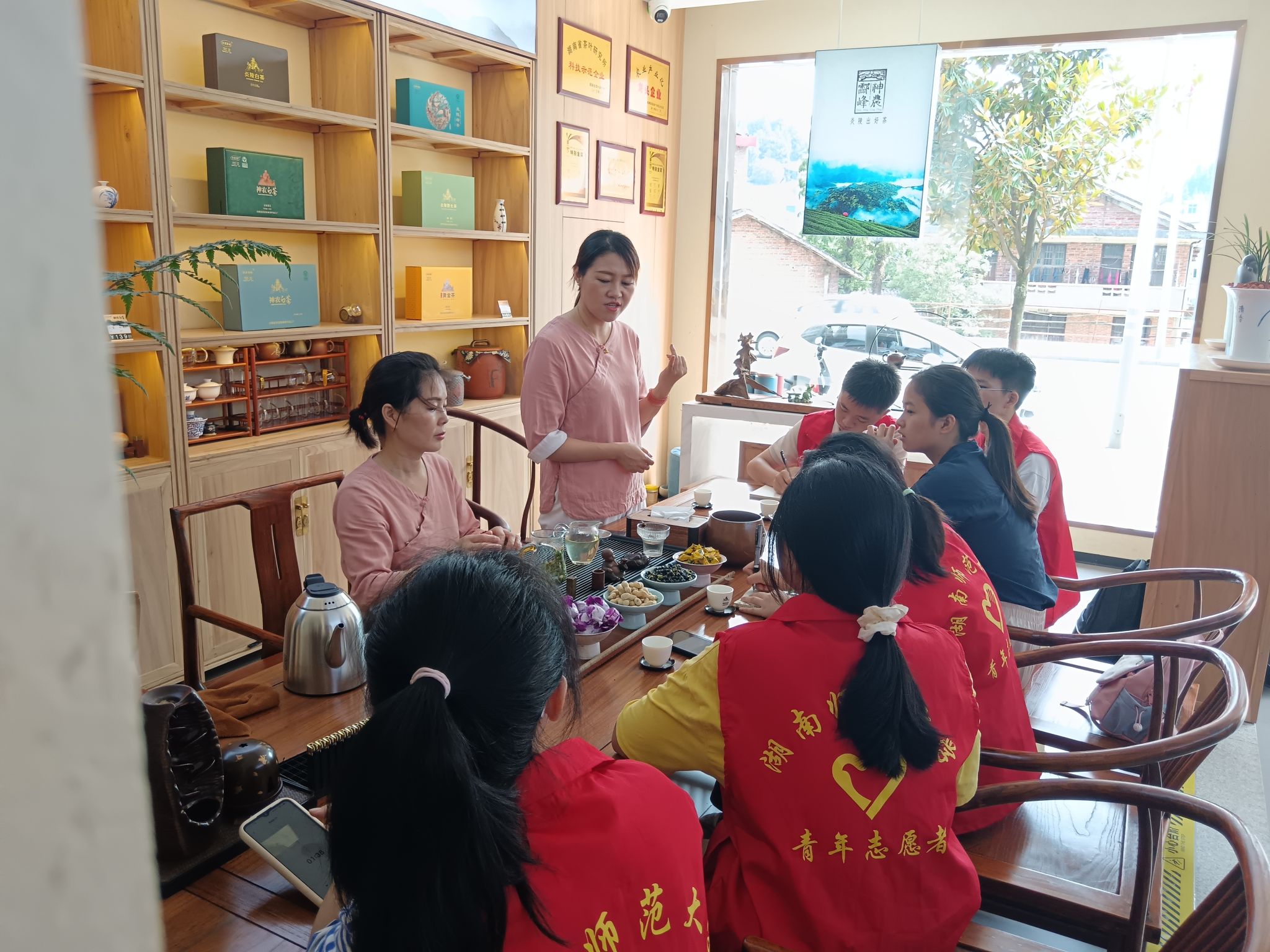 实践团成员前往炎陵当地白茶直营店,并采访店主。店主为成员们介绍店里销售茶叶类型及各种茶叶的特色,如白茶、野生红茶、老茶树茶、炎陵红茶等。她表示炎陵红茶作为当地特产,有“甘鲜味、花蜜香”之美誉,它曾代表株洲参加杭州国际茶叶博览会,并在第四届“国饮杯”评比中获一等奖。在谈及茶树的培养时,店主表示茶树的生长受到阳光、土壤、降水、温度等多重自然因素影响,对环境要求较高。其中,“神农白茶”每年只有十几天的采摘期,可采摘部分为一芽一叶,因此产量少、价格较高。随后,店内茶艺师为成员们简单介绍泡茶的步骤以及各个步骤的含义。成员们品尝部分当地特色茶水,并与工作人员合影留念。