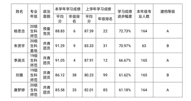 经学生本人申请、学院奖助学金评审工作小组研究审定,拟推荐杨思念等5名学生参评“长沙银行 2021-2022 学年度学业进步奖学金”,现将名单公示如下: