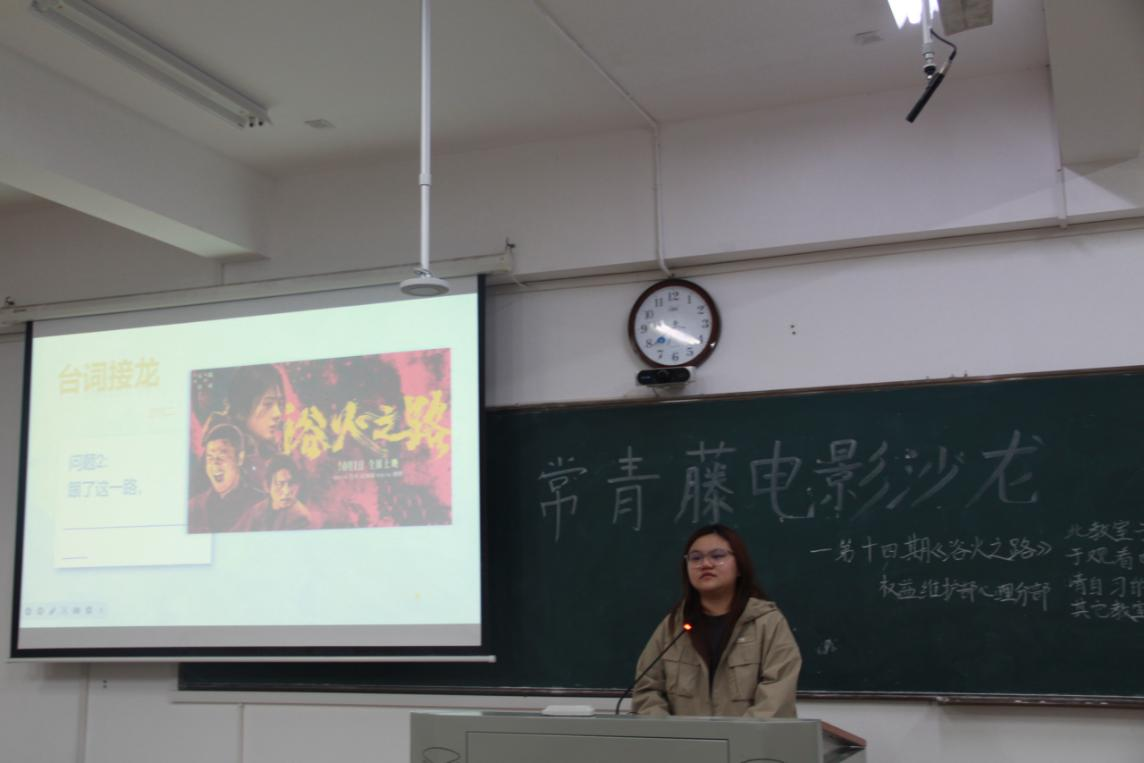 主持人向同学们介绍影片《浴火之路》的主要内容,这部影片以“寻亲打拐”为主题,主要讲述三位孩子被拐卖的父母组局,在蛮荒之地与一众人贩上演凶险反杀,最终在警察的配合下成功打拐,找回失散多年的亲人的故事。此次活动组织同学们聚焦精彩片段,分享自己的观影体悟。同学们表示,该影片混合着犯罪暴力、底层生态和因果宿命等人生启示,但在影片后三分之一的情节中,因为离奇设定,之前编剧和导演营造某种现实感有所崩塌。为增强同学们观看电影的体验感,主持人组织同学们进行了“过目不忘”、“台词接龙”等心理趣味游戏互动。