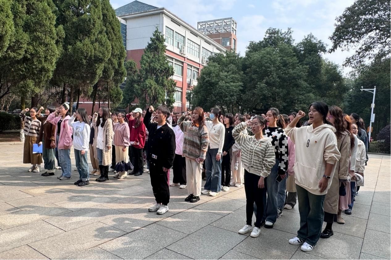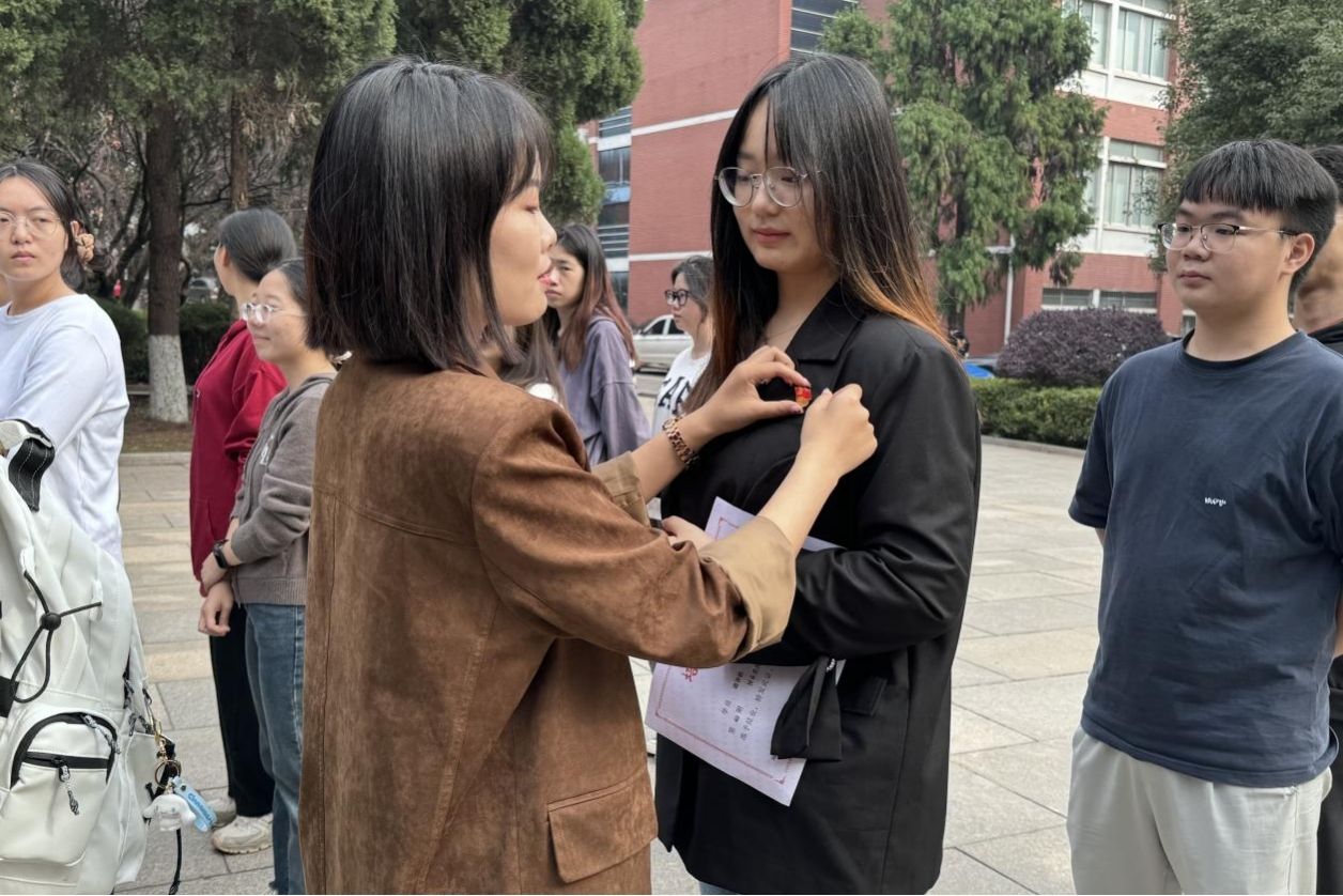 入党宣誓仪式于忠烈祠前坪举行,仪式分为吴晴致辞及宣读党员名单、发放并佩戴党徽、谌鑫怡带领党员同志重温入党誓词、正式党员代表、预备党员代表发言和支部成员自由讨论五项议程。吴晴提出,深入学习贯彻党的二十大精神应在原原本本学、联系实际学、利用网络学、交流探讨学四个方面下“苦功夫”,以学促进二十大精神的贯彻落实。正式党员代表表示,各党员同志应紧密团结在党的周围,跟好党的脚步,推动二十大精神于实践中落实。预备党员代表表示,各位预备党员应学习党的精神思想,具备党员的基本素质,为党补充新鲜血液。支部成员在自由讨论中提及要挖掘麓山忠烈祠等爱国主义教育资源,推动理论学习教育走深走实,并从中汲取丰富的政治营养,不断拓宽视野,树立远大理想。