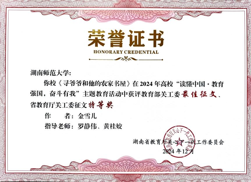 此外,金雪儿同学的作品《寻爷爷和他的农家书屋》脱颖而出,荣获教育部关工委“最佳征文”以及湖南省教育厅关工委“征文特等奖”。优秀教师罗静伟、黄桂姣全程指导,金雪儿同学以细腻且真挚的笔触,深刻传递出新时代青年的家国情怀。