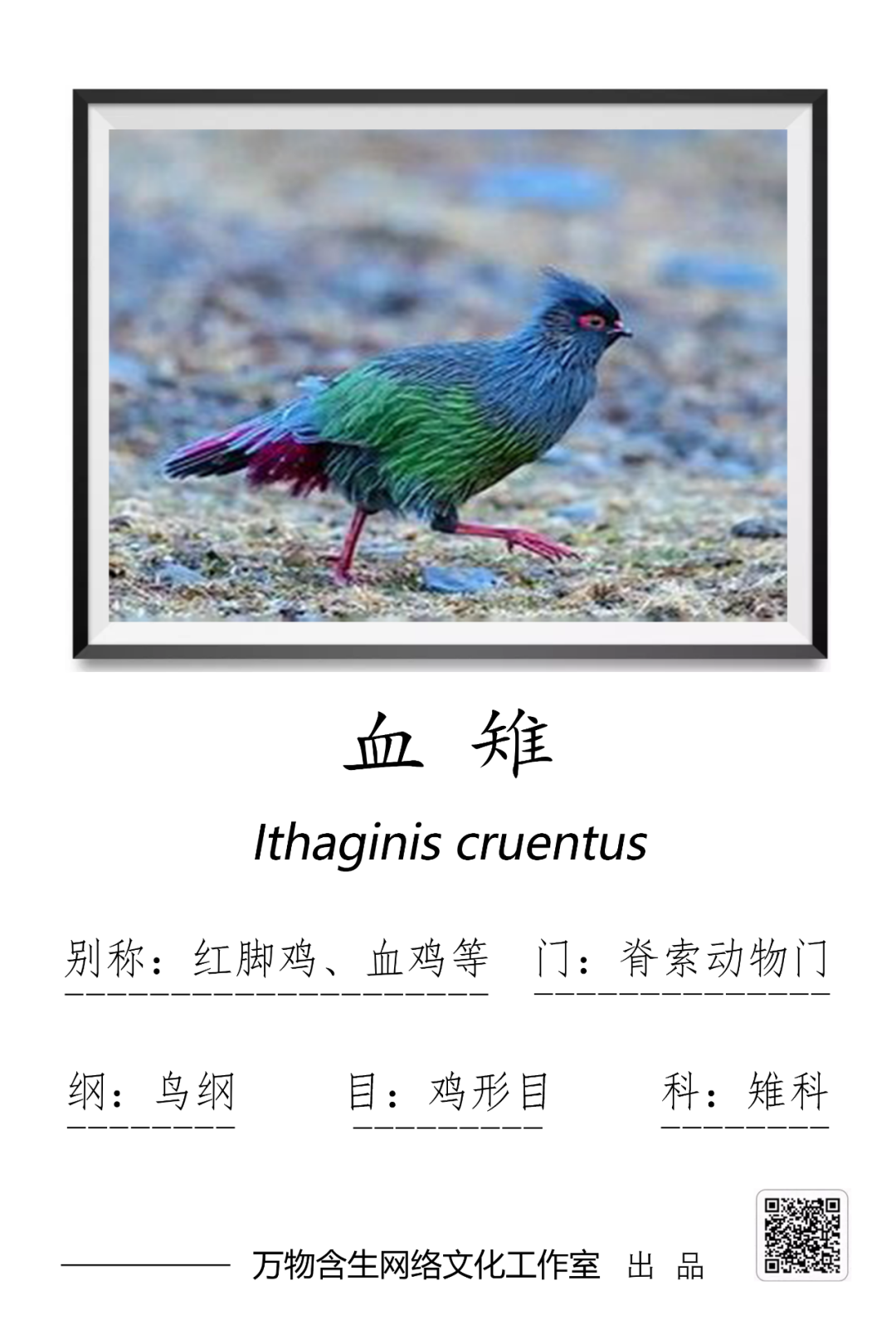 血雉(Ithaginis cruentus),鸡形目雉科血雉属,其别名甚多,各地皆异,其中流传最广的别名是红脚鸡,为国家二级重点保护野生动物。列入濒危野生动植物种国际贸易公约附录(CITES),濒危等级:附录II。列入中国濒危动物红皮书,等级:易危。列入中国《国家重点保护野生动物名录》,等级:二级。