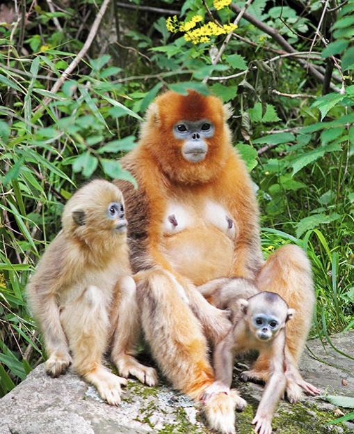 群居:金丝猴具有典型的家庭生活方式,成员之间相互关照,一起觅食、一起玩耍休息。