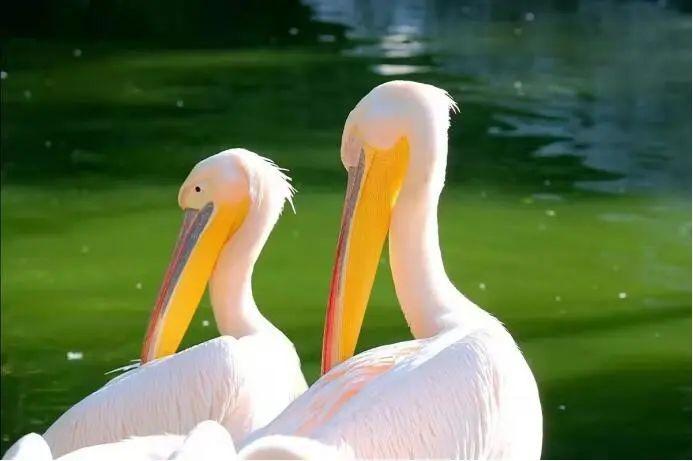 而相似种白鹈鹕体形粗短肥胖,颈细长。通体白色。嘴长而粗直,铅蓝色,嘴尖和上下嘴缘红色。嘴下有一橙黄色皮囊。胸有一簇黄色长的披针形羽毛。脚肉色。