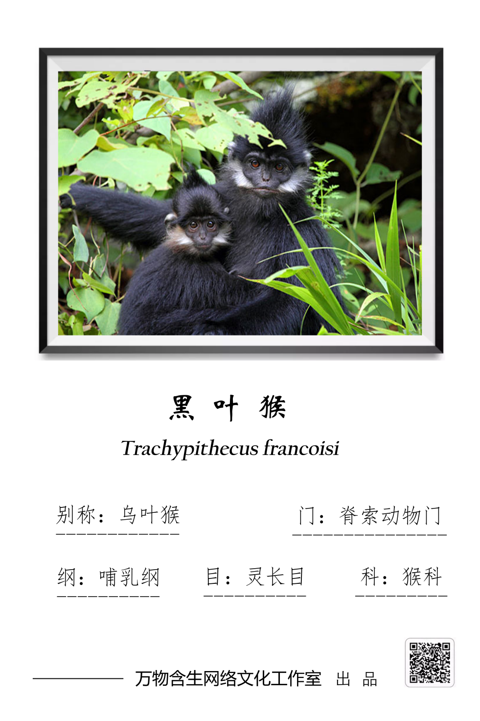 黑叶猴(Trachypithecus francoisi),是灵长目猴科叶猴属动物,别称乌猿、乌叶猴。列入中国《国家重点保护野生动物名录》(1989年1月14日)一级,列入《世界自然保护联盟濒危物种红色名录》(IUCN) 2015年——濒危(EN),列入中国《国家重点保护野生动物名录》(2021年2月5日)一级。