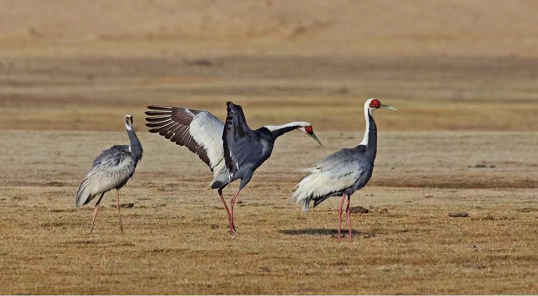 行为:除繁殖期成对活动外,多成家族群或小群活动,偶尔也见单独活动的,迁徙和越冬期间则多为数个或10多个家庭群组成的大群活动。行动机警,两翅扇动有力,飞行轻快。白枕鹤忠于爱情,恪守一夫一妻制,两只相爱的白枕鹤常常帮对方清理羽毛,甚至会有一些“亲吻”动作。
