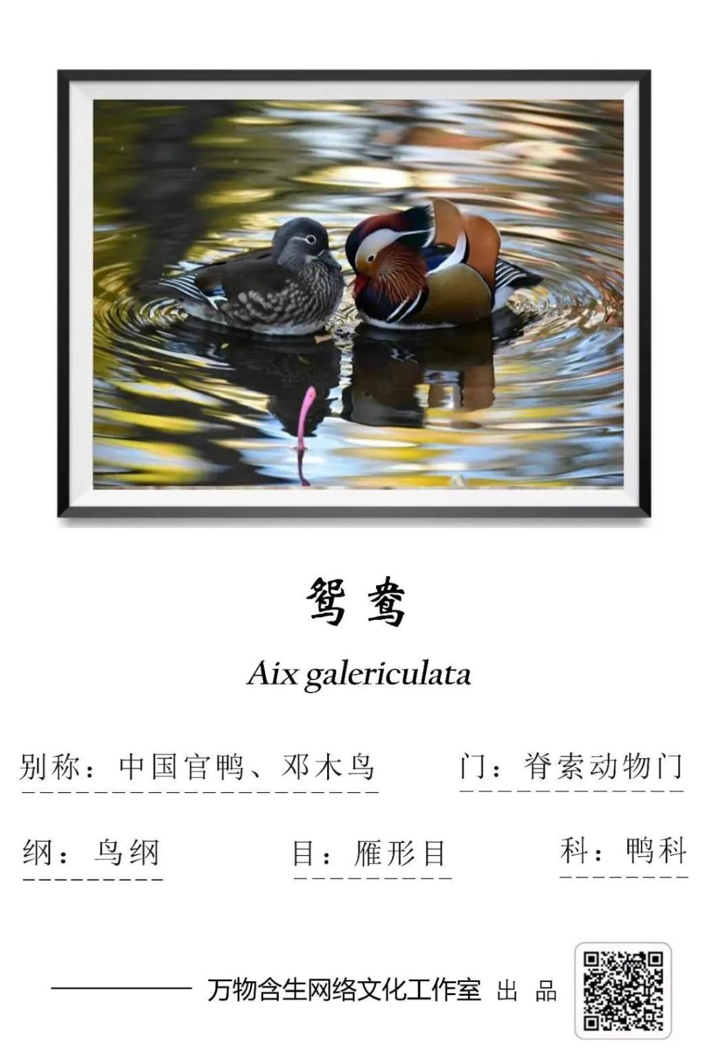 鸳鸯(Aix galericulata):属雁形目鸭科鸳鸯属,又被称为中国官鸭、邓木鸟等等。被列入《世界自然保护联盟濒危物种红色名录》(IUCN)——无危(LC)和中国《国家重点保护野生动物名录》二级。
