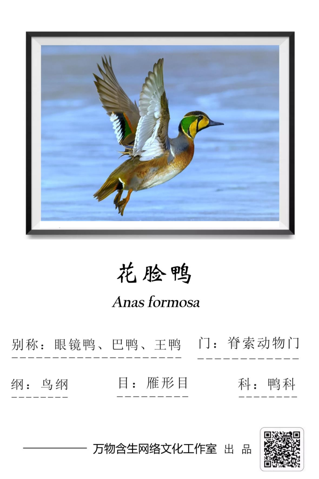 花脸鸭(Anas formosa),雁形目鸭科鸭属,其别名巴鸭、黑眶鸭、眼镜鸭、黄尖鸭、王鸭、晃鸭、元鸭,属于我国国家二级保护动物,被列入《世界自然保护联盟》(IUCN) 2012年濒危物种红色名录ver 3.1——低危(LC)。